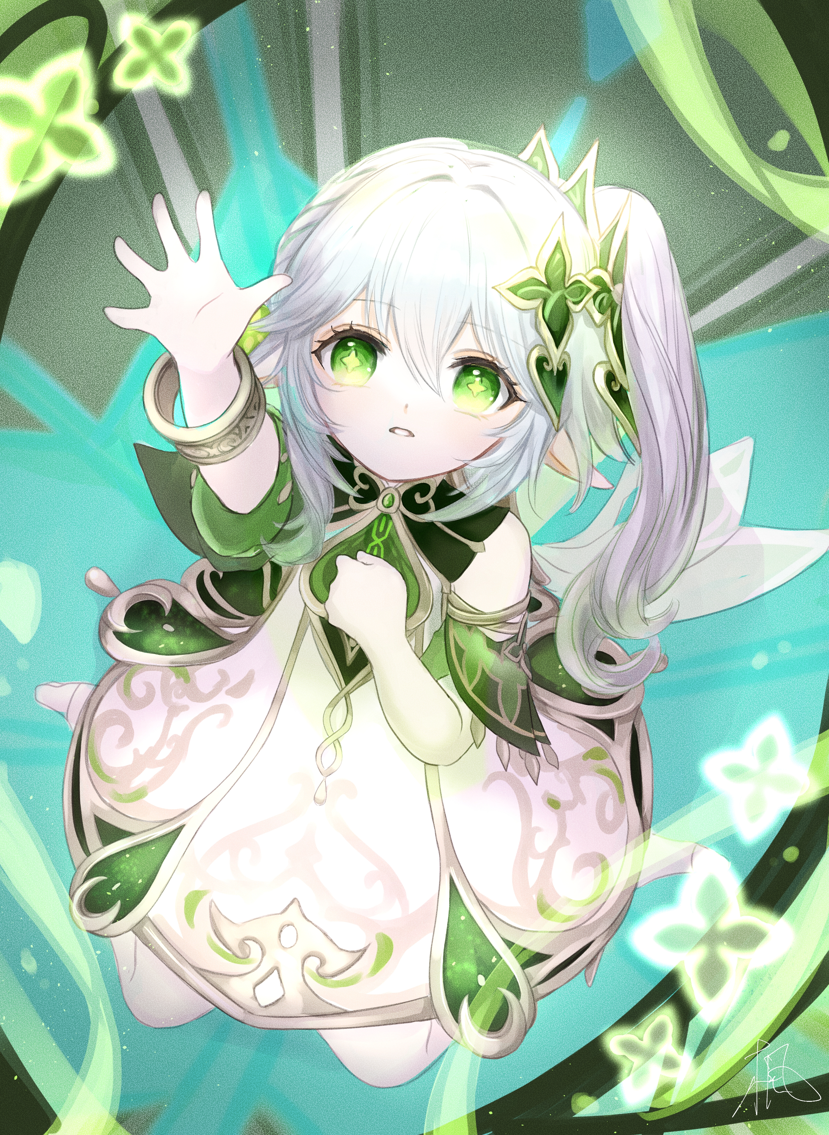 1girl absurdres arm_up bracelet cape clenched_hand commentary_request detached_sleeves dress film_grain from_above genshin_impact gold_trim gradient_hair green_eyes green_hair green_sleeves hair_between_eyes hair_ornament highres jewelry kaede_(kristallfantasie) kneeling leaf_hair_ornament looking_at_viewer looking_up multicolored_hair nahida_(genshin_impact) outstretched_arm parted_lips partial_commentary side_ponytail signature solo star-shaped_pupils star_(symbol) symbol-shaped_pupils teeth upper_teeth_only white_dress white_hair