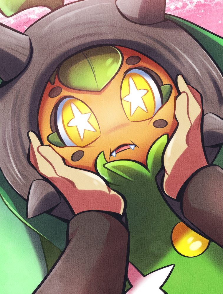 cheek_squash drawfag fangs hands_on_another's_cheeks hands_on_another's_face horns looking_at_viewer nintendo ogerpon ogerpon_(teal_mask) open_mouth petting pink_background pokemon pokemon_(creature) solo_focus star-shaped_pupils star_(symbol) symbol-shaped_pupils yellow_eyes