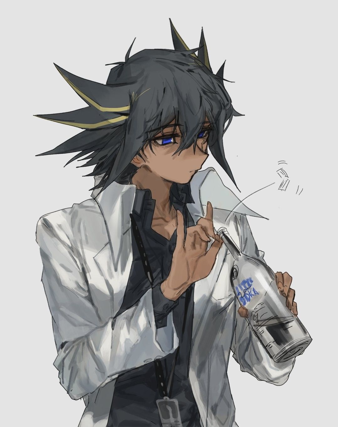 1boy alcohol black_hair blue_eyes bottle dress_shirt fudo_yusei glass_bottle grey_shirt highres holding holding_bottle lab_coat lanyard looking_down looking_to_the_side male_focus momentcorefly shirt third-party_source vodka white_background yu-gi-oh! yu-gi-oh!_5d's