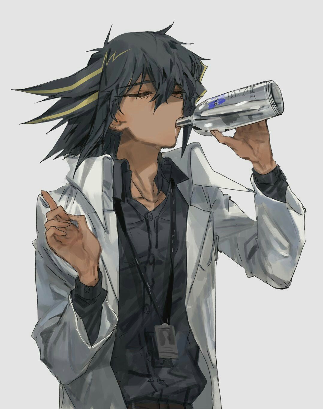 1boy alcohol arm_up belt black_hair black_pants closed_eyes dress_shirt drinking fudo_yusei glass_bottle grey_shirt hand_up highres lab_coat lanyard looking_to_the_side male_focus momentcorefly pants shirt third-party_source vodka white_background yu-gi-oh! yu-gi-oh!_5d's