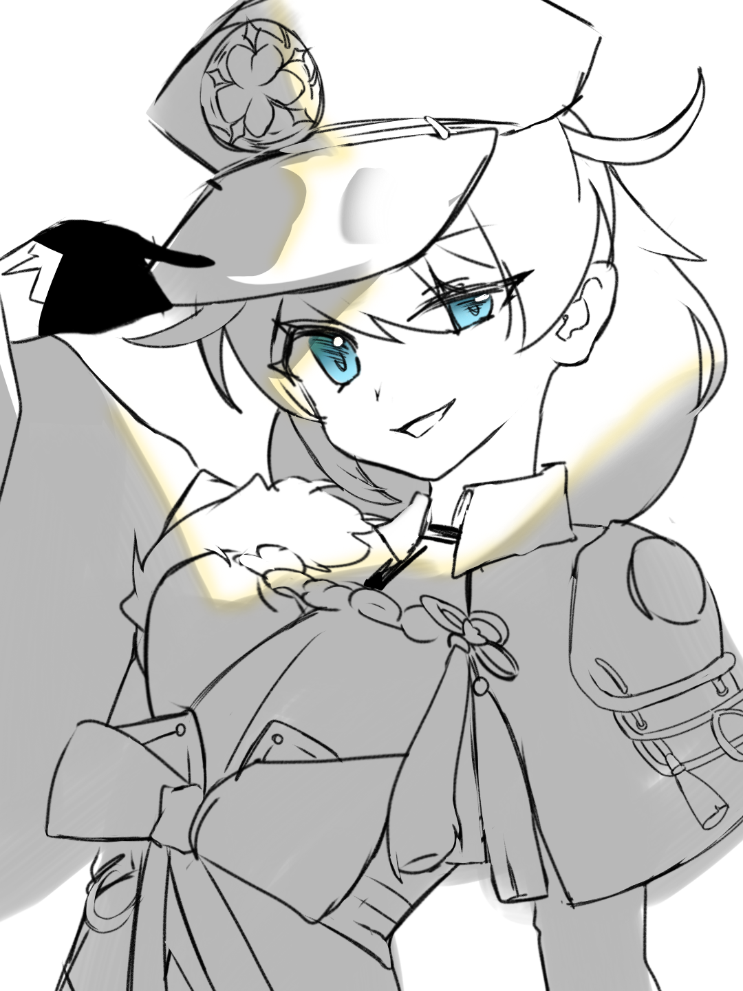 1girl arm_up black_gloves blue_eyes bow capelet close-up collared_shirt fur_trim gloves hair_between_eyes hat head_tilt highres honkai_(series) honkai_impact_3rd kallen_kaslana kallen_kaslana_(hanami_daimyo) looking_at_viewer ludougouqi monochrome open_mouth shade shirt simple_background solo standing sunlight tongue tongue_out white_background