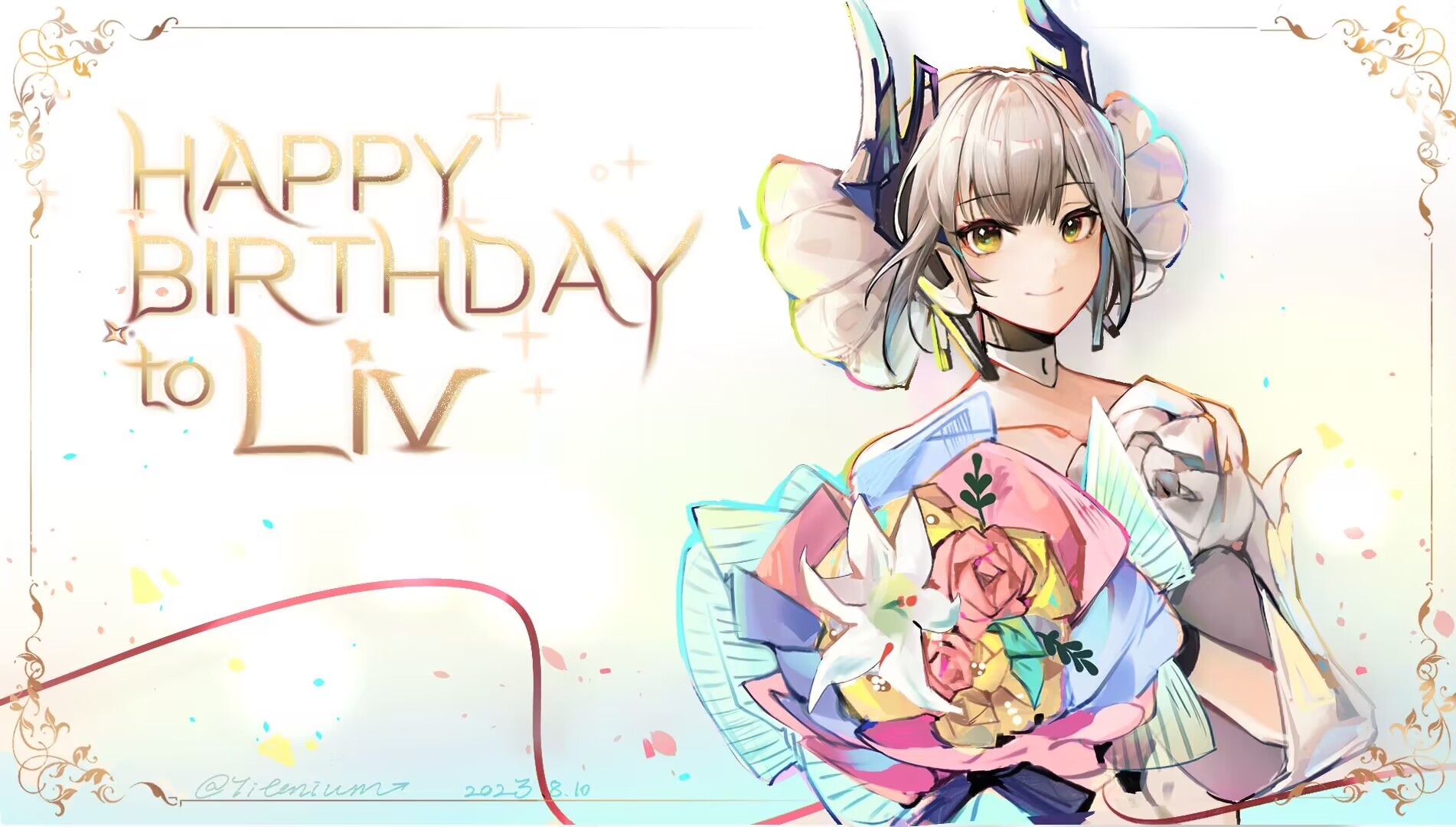 1girl bare_shoulders border bouquet character_name closed_mouth dated english_text flower grey_hair hair_ornament happy_birthday headgear highres holding holding_bouquet liv:_lux_(florescence)_(pgr) liv_(pgr) looking_at_viewer outside_border pink_flower punishing:_gray_raven short_hair smile solo titaniumtai twitter_username upper_body white_background white_flower yellow_border yellow_eyes