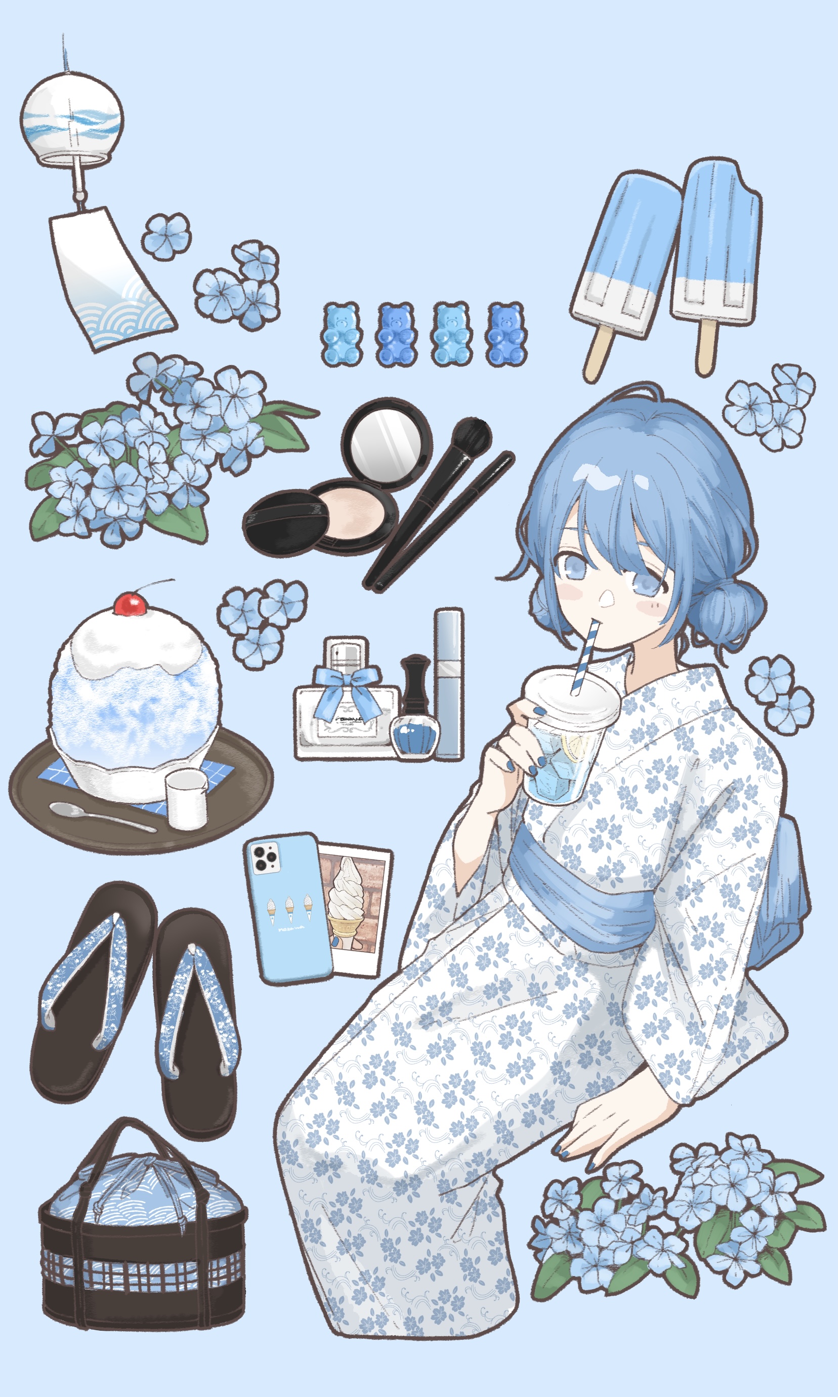 1girl absurdres basket black_footwear blue_background blue_eyes blue_flower blue_hair blue_nails blue_ribbon blue_sash blue_theme bottle candy cellphone cherry commentary_request compact_(cosmetics) cosmetics cream cropped_legs cup double_bun drinking drinking_straw drinking_straw_in_mouth fingernails flower food food_print fruit geta gummy_bear hair_bun highres holding holding_cup ice_cream_bar ice_cream_print japanese_clothes kimono leaf long_sleeves looking_at_viewer makeup_brush mirror nail_polish_bottle napkin nozawa_(nooo1709) obi original perfume_(cosmetics) perfume_bottle phone photo_(object) powder_puff print_kimono ribbon sandals sash seigaiha shaved_ice simple_background sitting smartphone solo spoon tray unworn_sandals what's_in_my_bag white_kimono wide_sleeves wind_chime yukata