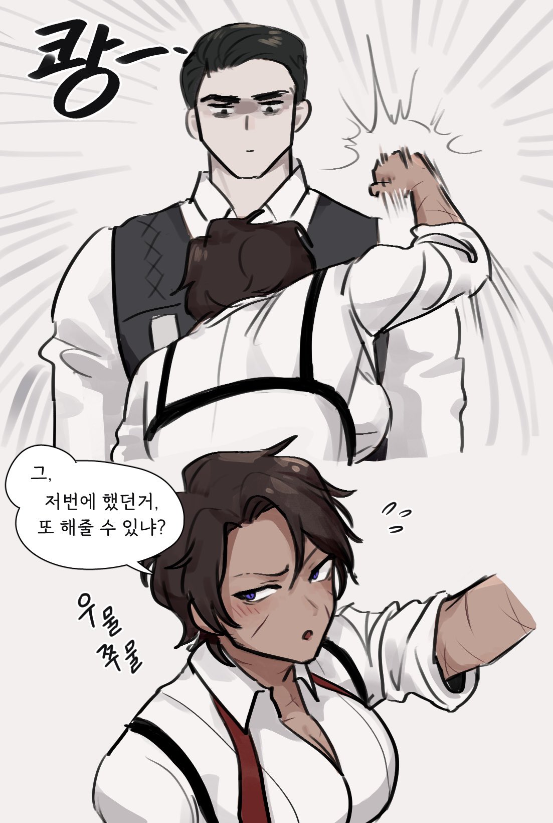 1boy 1girl black_vest blush breasts chest_harness cleavage collared_shirt dark-skinned_female dark_skin genderswap genderswap_(mtf) harness heathcliff_(project_moon) highres korean_commentary korean_text limbus_company looking_at_another looking_down meursault_(project_moon) multiple_scars necktie project_moon punching purple_eyes scar scar_on_face shirt short_hair sleeves_rolled_up undone_necktie vest white_shirt youngyeah57