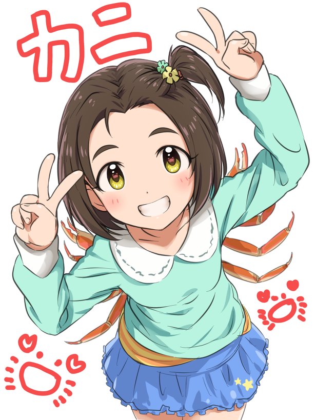 1girl blue_skirt blush breasts brown_hair cowboy_shot crab dani-ikapi dot_nose double_v flower green_flower green_shirt grin hair_flower hair_ornament hands_up idolmaster idolmaster_cinderella_girls idolmaster_cinderella_girls_starlight_stage long_sleeves looking_at_viewer one_side_up pleated_skirt shirt short_hair side_ponytail skirt small_breasts smile solo standing v white_background yanase_miyuki yellow_eyes yellow_flower