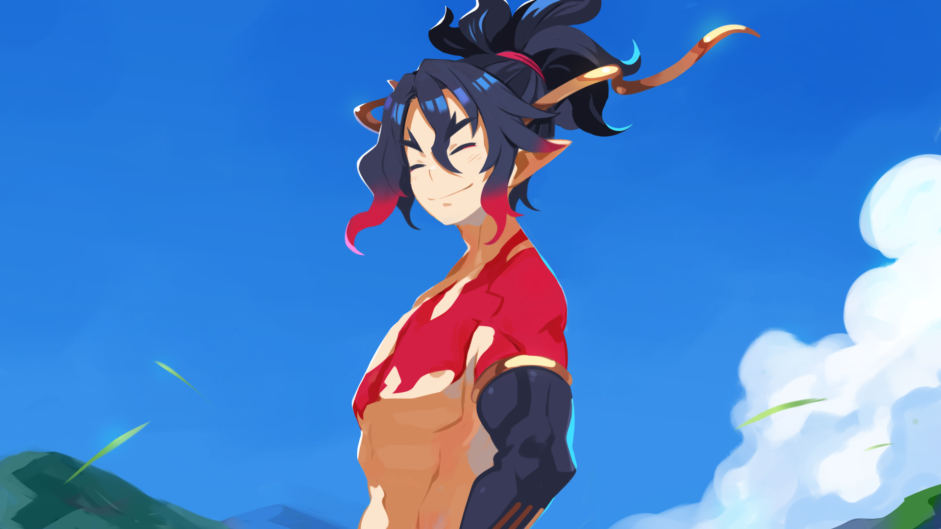 1boy black_hair blue_sky closed_eyes demon_boy disgaea fuji_(disgaea) harada_takehito highres horns makai_senki_disgaea_7 multicolored_hair official_art pointy_ears ponytail red_hair sidelocks sky smile
