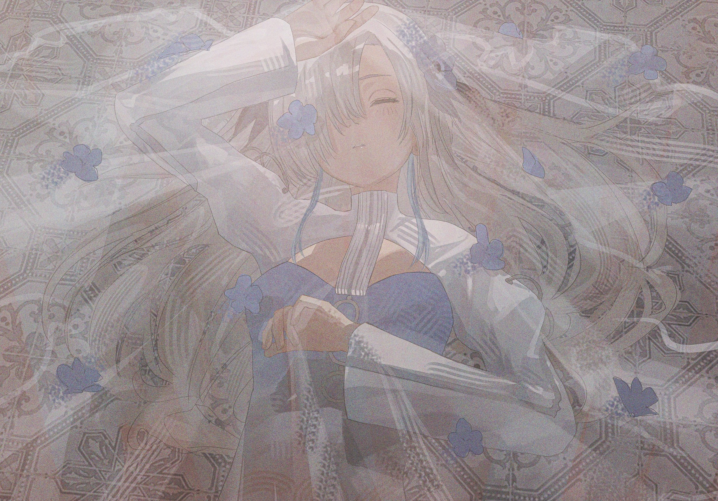 1girl anemone_(flower) blue_dress blue_flower blue_hair closed_eyes cute_mdr dress film_grain flower grey_hair hair_flower hair_ornament hair_over_one_eye hand_up highres isekaijoucho juliet_sleeves kamitsubaki_studio long_hair long_sleeves lying multicolored_hair nemophila_(flower) on_back on_floor parted_lips puffy_sleeves solo streaked_hair two-tone_dress two-tone_hair upper_body virtual_youtuber white_dress