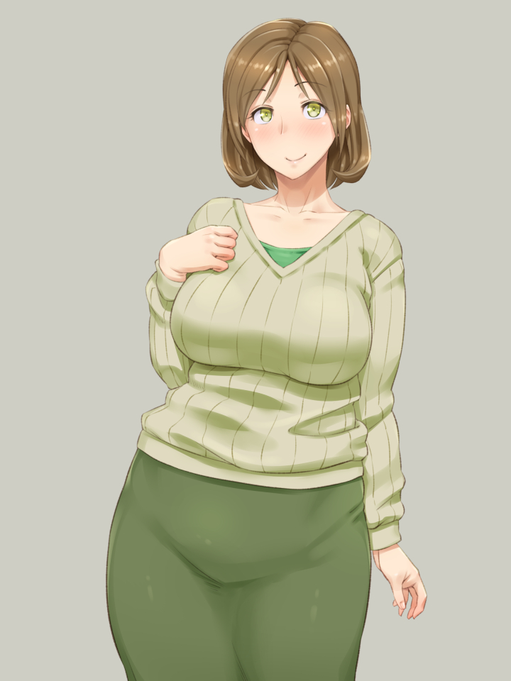 1girl arm_at_side blush breasts brown_hair collarbone cowboy_shot green_shirt grey_background hand_on_own_chest light_blush long_sleeves looking_at_viewer mature_female original shikuta_maru shirt short_hair simple_background sweater yellow_eyes