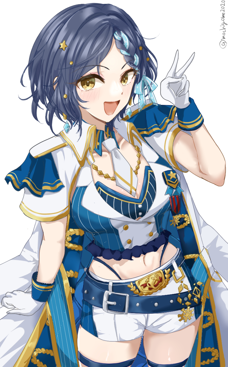 1girl artist_name belt blue_belt blue_bow blue_hair bow braid breasts buttons chamumi_(mochiumee) collarbone cropped_jacket dark_blue_hair double-breasted gloves gold_trim hair_bow hayami_kanade highres idolmaster idolmaster_cinderella_girls medal necktie open_mouth parted_bangs short_hair short_sleeves shorts simple_background smile solo star_(symbol) v white_background white_gloves white_necktie white_shorts yellow_eyes