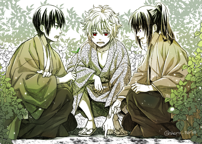 3boys aged_down collarbone gintama green_eyes hair_between_eyes hakama hakama_pants holding holding_stick japanese_clothes katsura_kotarou kimono long_sleeves male_focus multiple_boys open_mouth pants pointing ponytail profile red_eyes sakata_gintoki sandals squatting stick takasugi_shinsuke tsurumura_ichiru twitter_username wide_sleeves