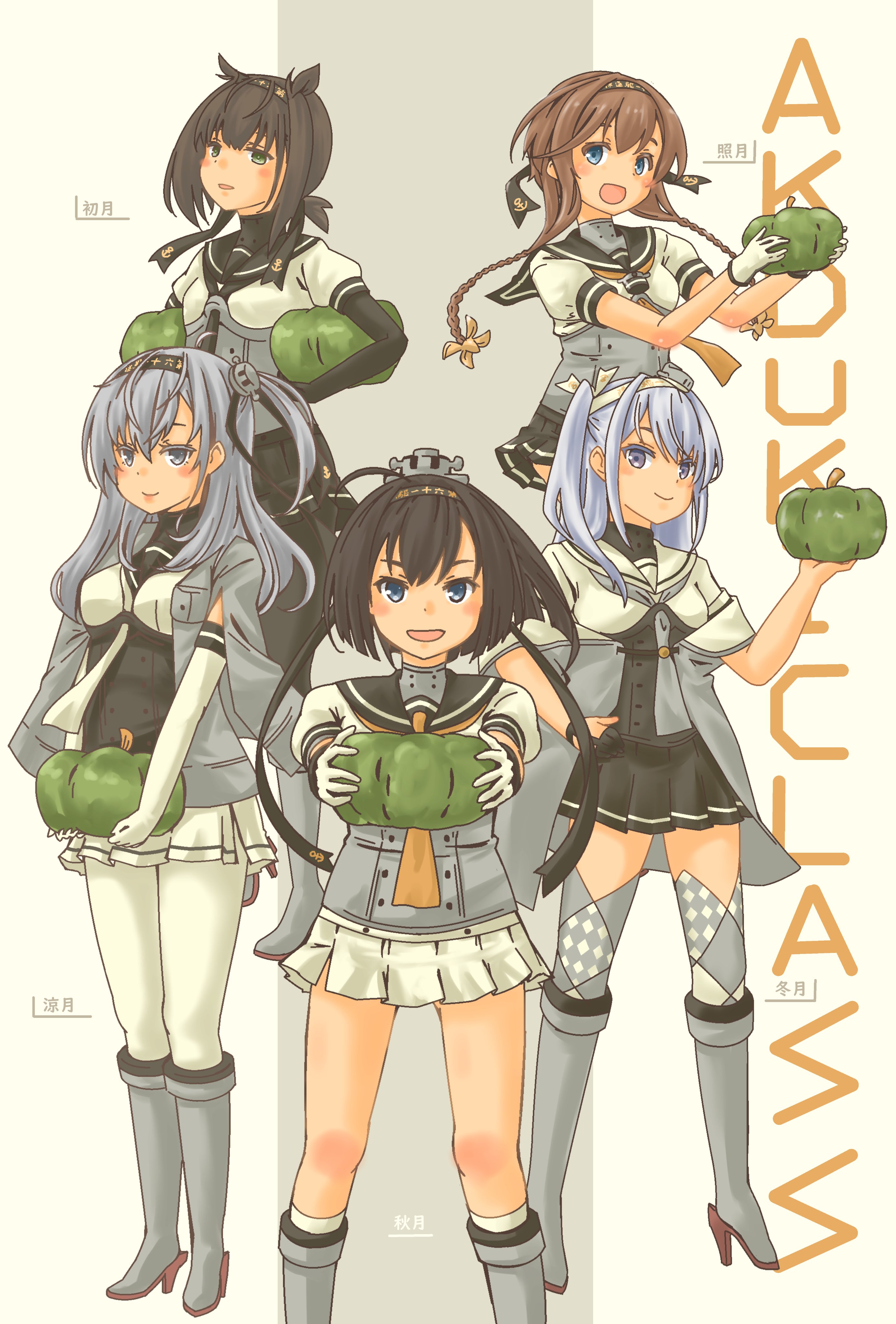 5girls absurdres akizuki_(kancolle) black_hair black_headband black_sailor_collar blue_eyes blush bodysuit border breasts brown_hair clothes_writing cowboy_shot dated feet_out_of_frame fuyutsuki_(kancolle) gloves gradient_background grey_hair hachimaki hair_ornament hairband hatsuzuki_(kancolle) headband highres holding kantai_collection long_hair looking_at_viewer multiple_girls neckerchief open_mouth pantyhose pink_background pleated_skirt ponytail pot-de pumpkin sailor_collar school_uniform serafuku short_hair side_ponytail skirt smile suzutsuki_(kancolle) teruzuki_(kancolle) twitter_username white_border white_skirt