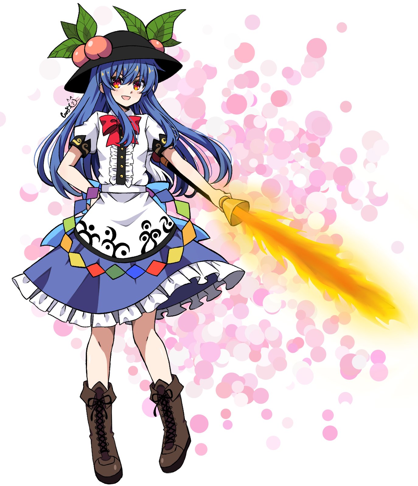 1girl artist_name black_hat blue_hair blue_skirt blush boots bow bowtie brown_boots caro-xy commentary dress food frills fruit hat hat_ornament highres hinanawi_tenshi holding holding_sword holding_weapon lace-up_boots leaf long_hair looking_at_viewer open_mouth peach puffy_sleeves red_bow red_bowtie red_eyes shirt short_sleeves skirt smile solo sword sword_of_hisou touhou weapon white_shirt