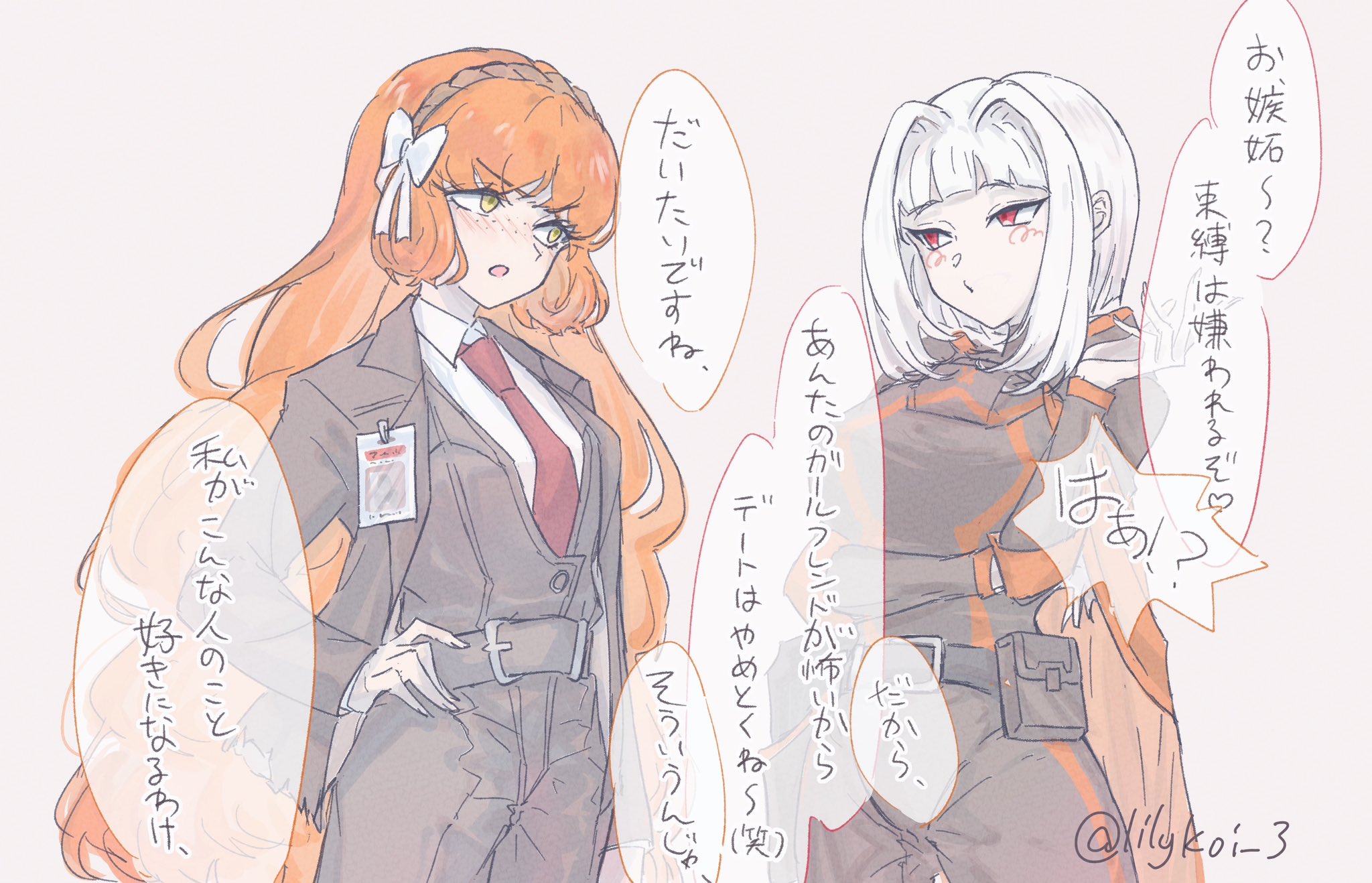 2girls armor belt black_armor black_belt black_jacket blush bow brown_hairband cape cowboy_shot hair_bow hair_intakes hairband highres id_card ishmael_(project_moon) jacket limbus_company lobotomy_corporation long_sleeves looking_at_another looking_to_the_side multiple_girls myo_(project_moon) open_mouth orange_cape project_moon red_eyes riri_(kira0311) rope short_hair simple_background speech_bubble translation_request white_background white_bow white_hair wing_collar