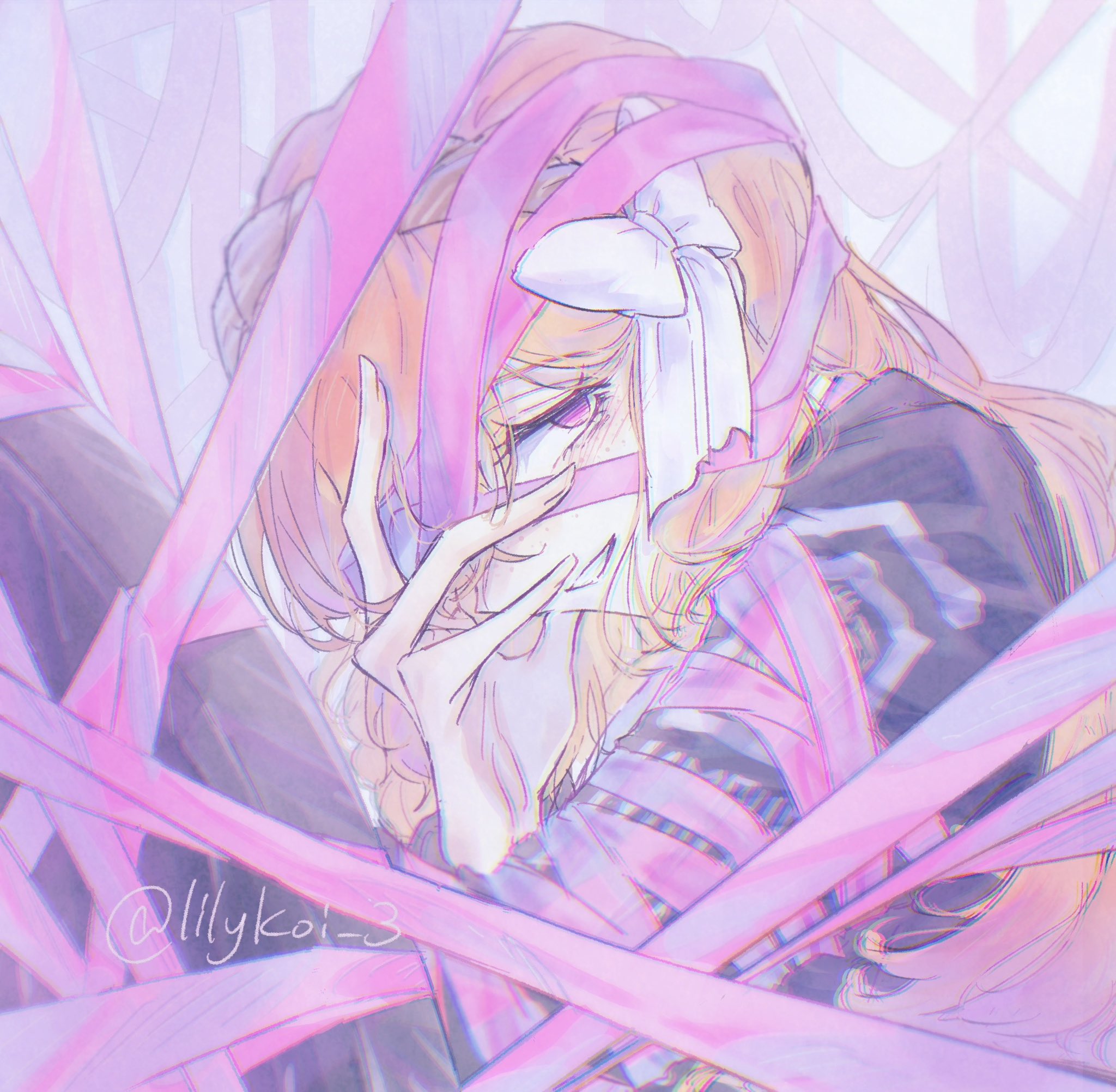 1girl black_jacket black_pants bow e.g.o_(project_moon) hair_bow highres ishmael_(project_moon) jacket limbus_company long_hair long_sleeves looking_at_viewer open_mouth orange_hair pants pink_eyes pink_ribbon project_moon ribbon riri_(kira0311) roseate_desire_(e.g.o) simple_background smile solo very_long_hair white_background white_bow