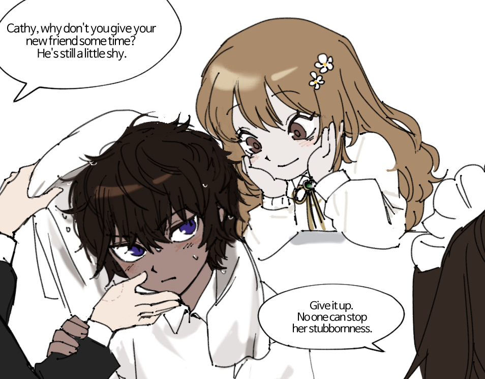 1boy 3girls bite_mark blush brown_eyes brown_hair catherine_(project_moon) closed_mouth collared_shirt drying drying_hair english_text erica_(wutheright) flower hair_flower hair_ornament hands_up heathcliff_(project_moon) holding holding_towel limbus_company long_hair long_sleeves maid_headdress multiple_girls neck_ribbon nelly_(project_moon) original project_moon ribbon shirt sidelocks simple_background smile speech_bubble towel wet wet_hair white_background white_shirt wutheright