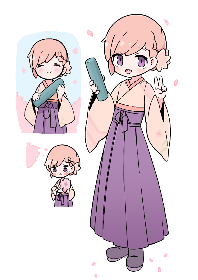1girl bemani blush bouquet braid chise_(pop'n_music) diploma falling_petals flower full_body graduation grey_footwear holding holding_bouquet holding_diploma japanese_clothes kimono kiosk_(artist) open_mouth petals pink_hair pop'n_music short_hair smile spring_(season) v wide_sleeves