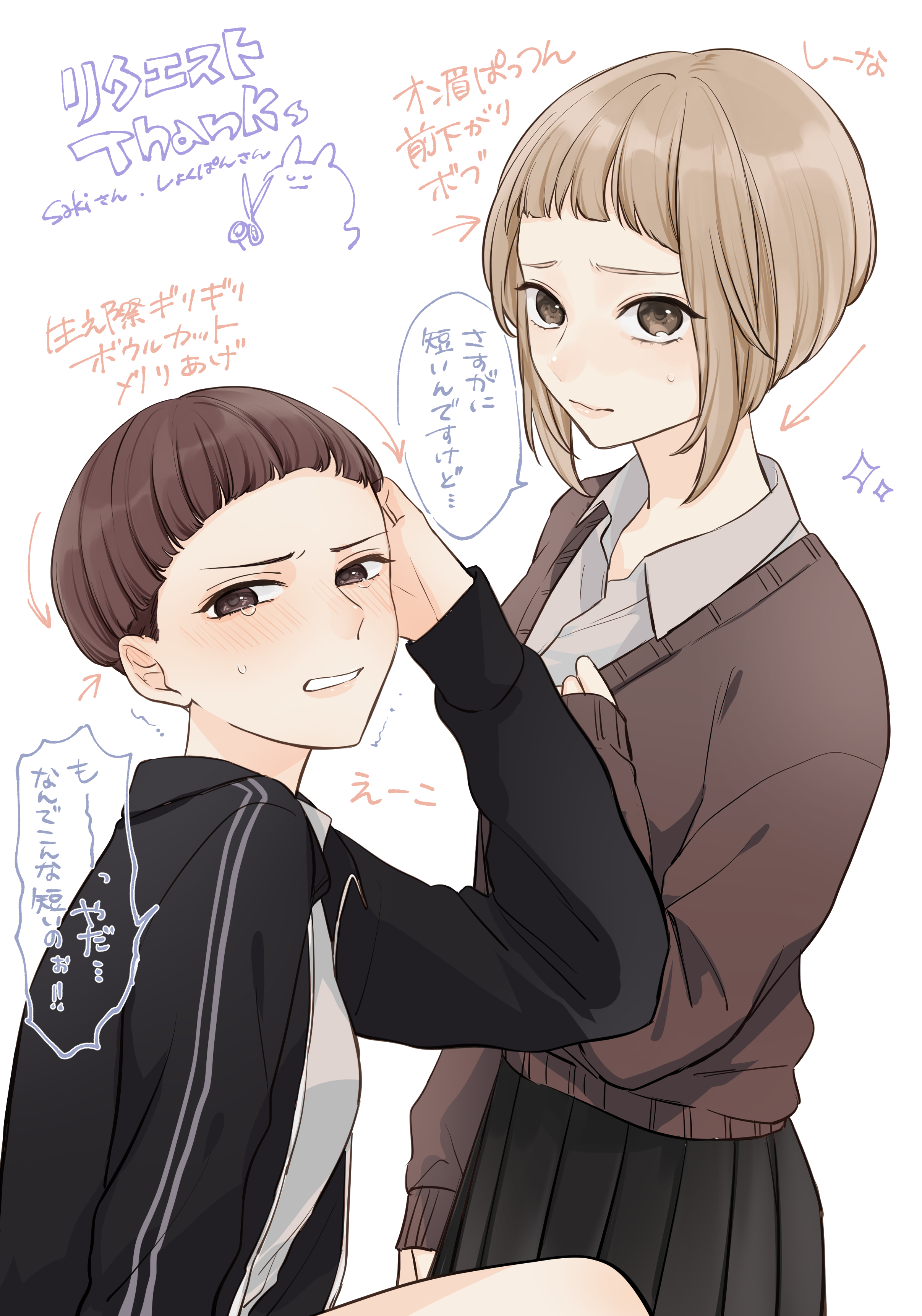 1girl 2girls absurdres alternate_hairstyle arrow_(symbol) black_jacket black_skirt blonde_hair blunt_bangs blush bob_cut bowl_cut breasts brown_eyes brown_hair brown_sweater closed_mouth collared_shirt cowboy_shot diamond_(shape) embarrassed english_text from_side frown glaring hand_on_own_chest hand_on_own_face hand_up highres inverted_bob jacket knees kyoi_hey lips long_sleeves looking_at_viewer motion_lines multicolored_jacket multiple_girls original pink_lips pleated_skirt rabbit school_uniform scissors shirt short_hair simple_background skirt small_breasts speech_bubble sweat sweater talking tears teeth trembling two-tone_jacket undercut upper_body v-shaped_eyebrows white_background white_shirt