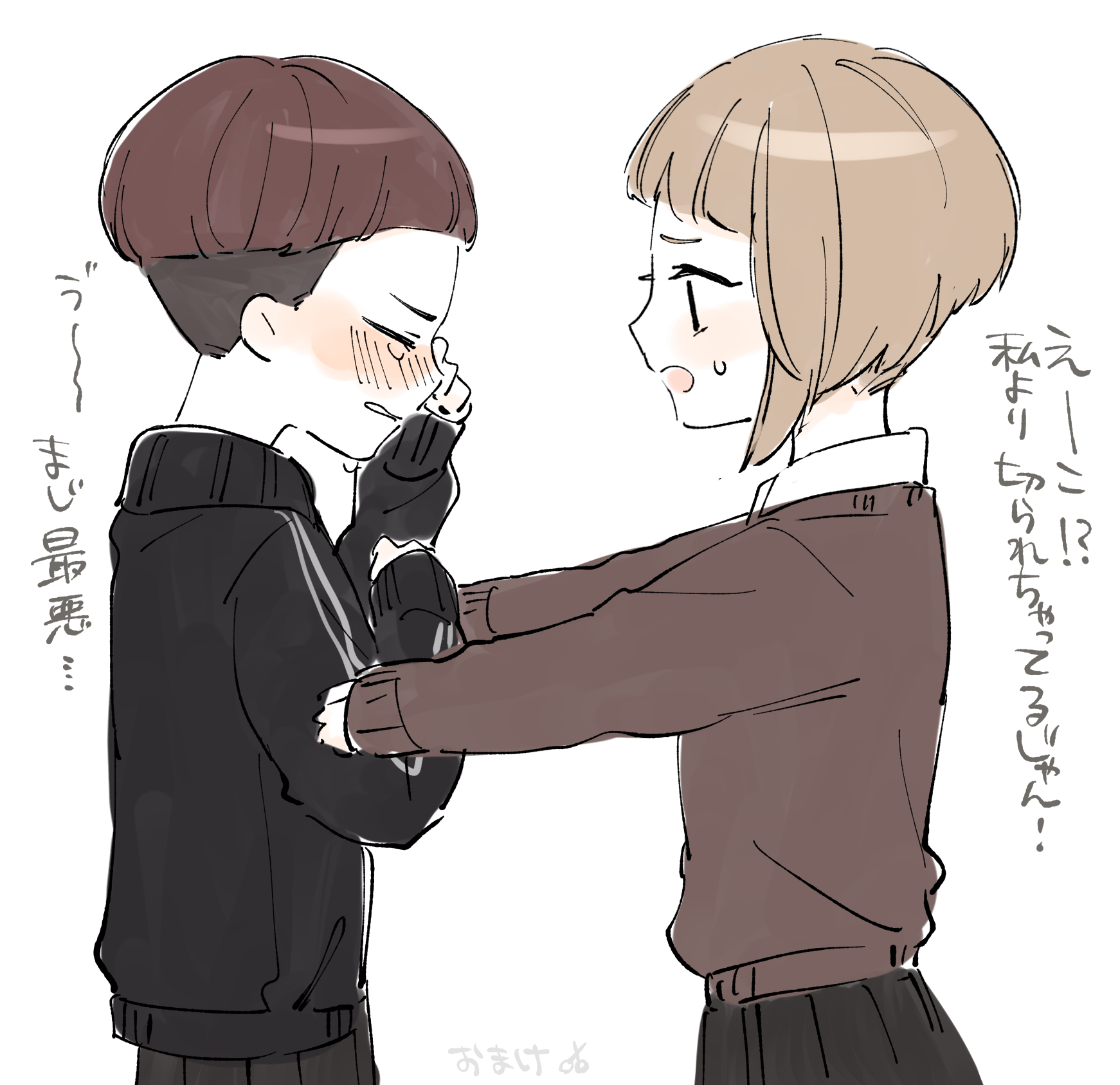 2girls alternate_hairstyle black_jacket black_skirt blonde_hair blunt_bangs blush bob_cut bowl_cut brown_hair brown_sweater closed_eyes collared_shirt colored_skin comforting cowboy_shot crying from_side furrowed_brow hand_on_another's_arm hand_on_own_face highres inverted_bob jacket kyoi_hey long_sleeves multiple_girls open_mouth pleated_skirt sad school_uniform shirt short_hair simple_background skirt sobbing sweat sweater tears translated undercut white_background white_shirt white_skin wiping_tears