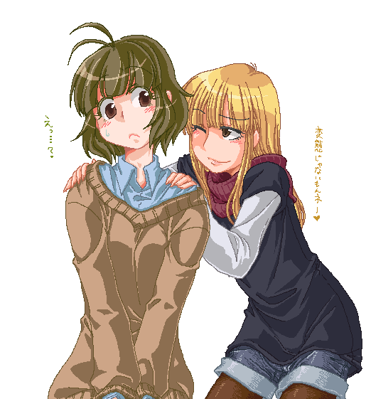 1boy 1girl ahoge akizuki_ryo aliasing blonde_hair blunt_bangs blush brown_eyes brown_sweater commentary crossdressing crossdressing_(mtf) crossover flat_chest green_hair idolmaster long_hair maman medium_hair one_eye_closed oozora_hibari pantyhose scarf shorts stop!!_hibari-kun! sweater translation_request trap white_background