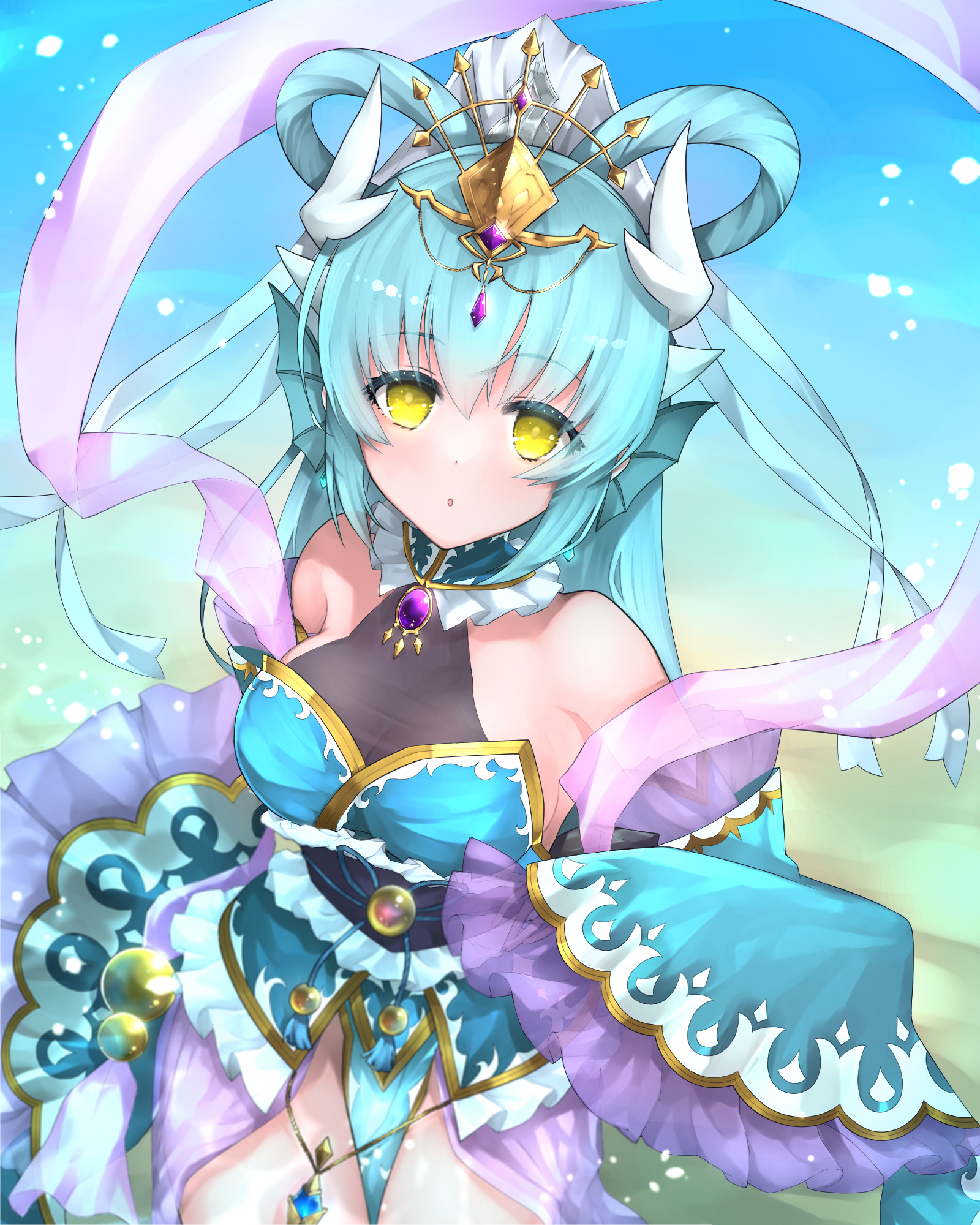 1girl breasts dragon_girl dragon_horns fate/grand_order fate_(series) folding_fan gradient_sky hair_rings hand_fan hazuki-a headpiece highres horns kiyohime_(fate) long_hair looking_at_viewer medium_breasts multiple_horns otohime_kiyohime_(fate) sash sky solo white_horns wide_sleeves yellow_eyes