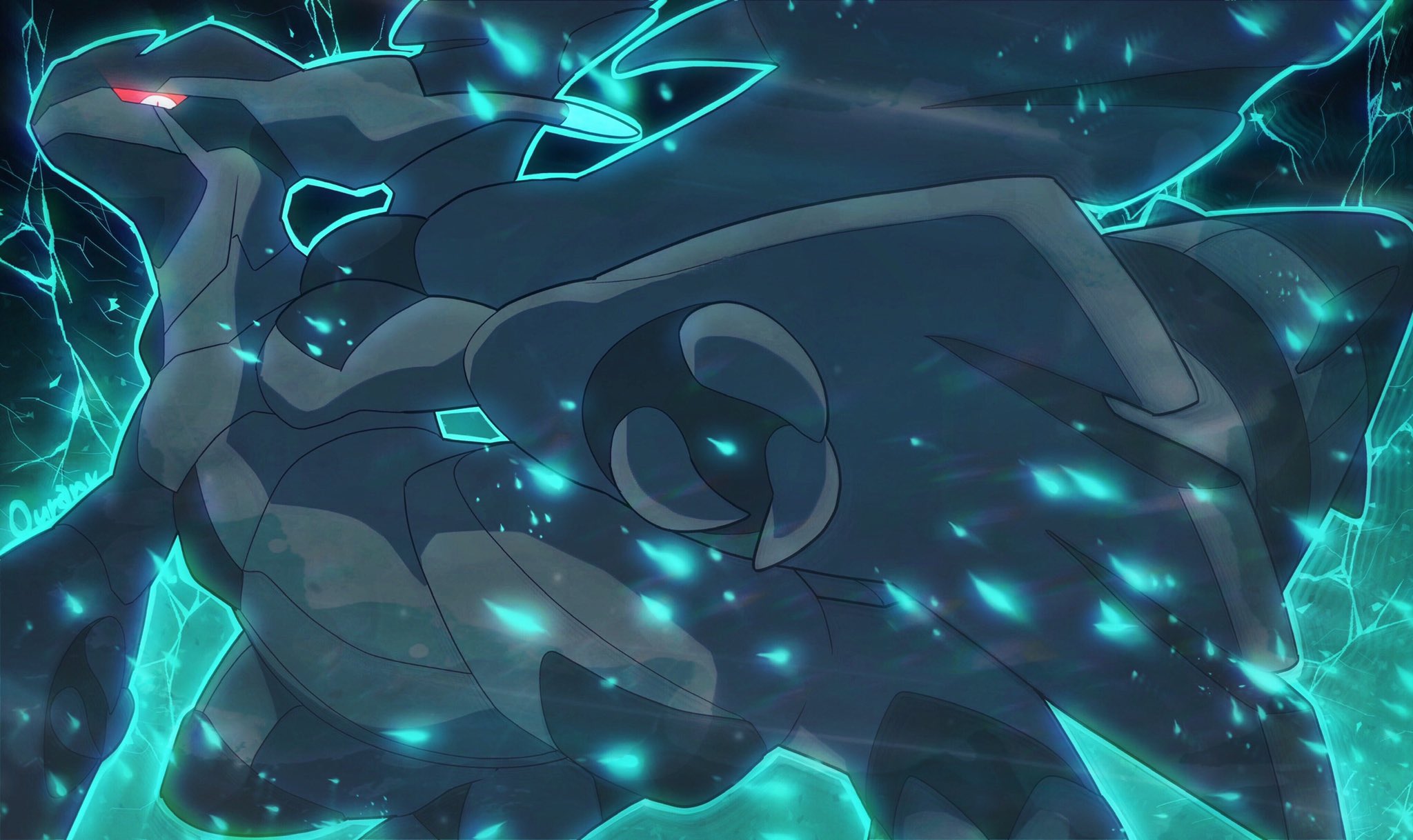 black_skin claws closed_mouth colored_sclera colored_skin dragon full_body gen_5_pokemon highres legendary_pokemon nintendo no_humans ouran pokemon pokemon_(creature) red_sclera solo tail thunder white_eyes wings zekrom