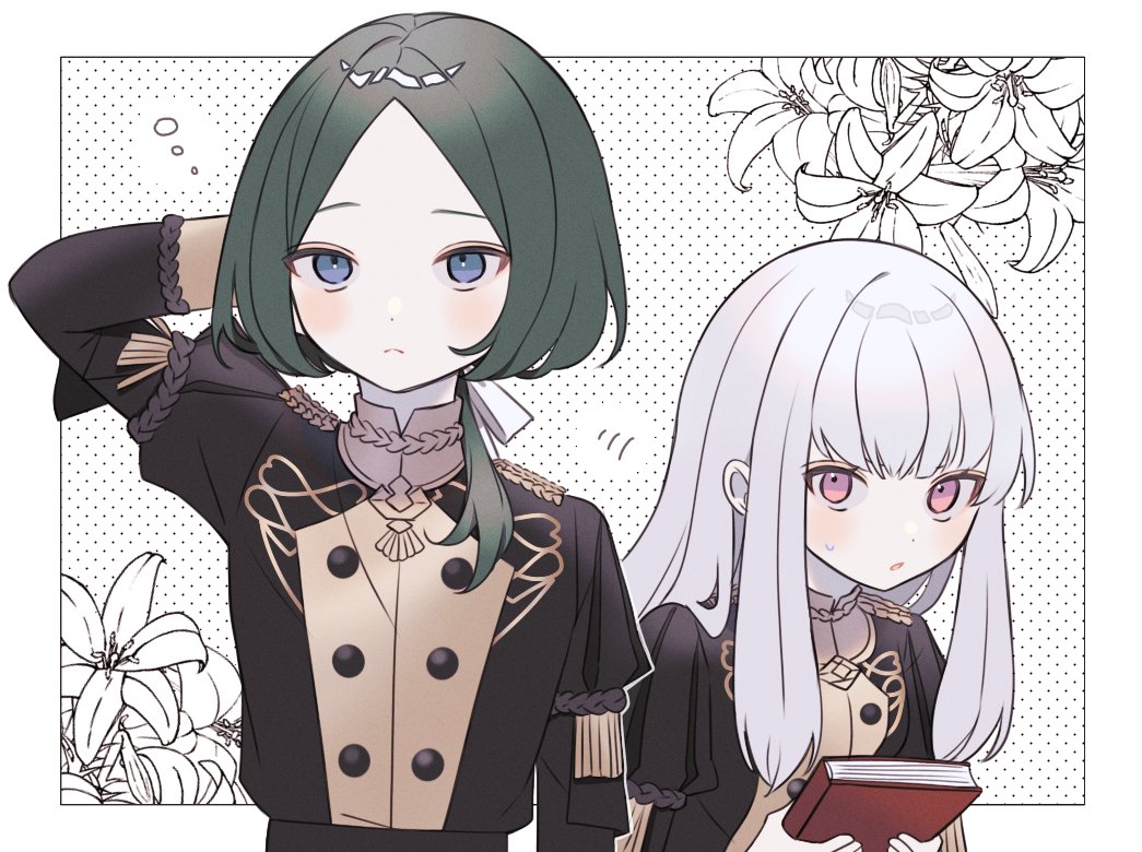 1boy 1girl arm_up black_jacket blue_eyes book closed_mouth fire_emblem fire_emblem:_three_houses garreg_mach_monastery_uniform green_hair holding holding_book jacket linhardt_von_hevring long_hair long_sleeves looking_at_viewer low_ponytail lysithea_von_ordelia nintendo open_mouth parted_bangs pink_eyes ponytail purinacow white_background white_hair