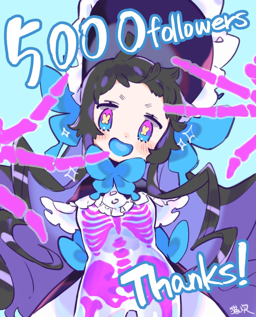 1girl :d artist_name black_hair black_veil blue_background blue_bow blue_eyes blue_male_underwear bonnet bow bowtie breasts capelet cleavage colored_mouth contrapposto cross-shaped_pupils dot_nose english_text forehead frilled_capelet frills gradient_eyes hair_bow highres looking_at_viewer male_underwear milestone_celebration monsha_moa multicolored_eyes no_nipples open_mouth original pink_eyes purple_eyes purple_veil rayman_limbs short_bangs short_eyebrows short_hair_with_long_locks sidelocks signature skeletal_hand skeleton_print small_breasts smile solo standing symbol-shaped_pupils thank_you two-sided_veil underwear upper_body v-shaped_eyebrows veil yellow_pupils