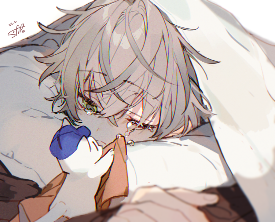 1boy alban_knox brown_hair cat crying dated handkerchief holding holding_handkerchief jacket male_focus nijisanji nijisanji_en one_eye_closed sapphire_(nine) signature simple_background solo takaradachi_(alban_knox) tears under_covers virtual_youtuber white_background white_jacket wiping_tears