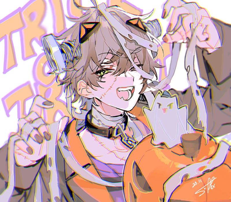 1boy alban_knox bandage_over_one_eye bandaged_neck bandages black_choker brown_hair choker commentary_request dated fingernails grey_jacket halloween halloween_costume hands_up jack-o'-lantern jacket korean_commentary long_sleeves looking_at_viewer male_focus nail_polish nijisanji nijisanji_en object_through_head one_eye_closed one_eye_covered open_mouth patchwork_skin sapphire_(nine) screw_in_head signature simple_background smile solo takaradachi_(alban_knox) virtual_youtuber white_background
