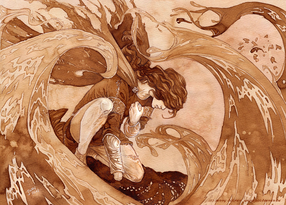 bracer brown_theme cape coffee_(medium) embroidery grimace hair_over_eyes holding_to_chest jenny_dolfen knee_up lava maedhros amputee monochrome on_one_knee painting_(medium) sepia silmaril_(gem) the_silmarillion tolkien's_legendarium tolkien's_legendarium torn_cape torn_clothes traditional_media watercolor_(medium) waves