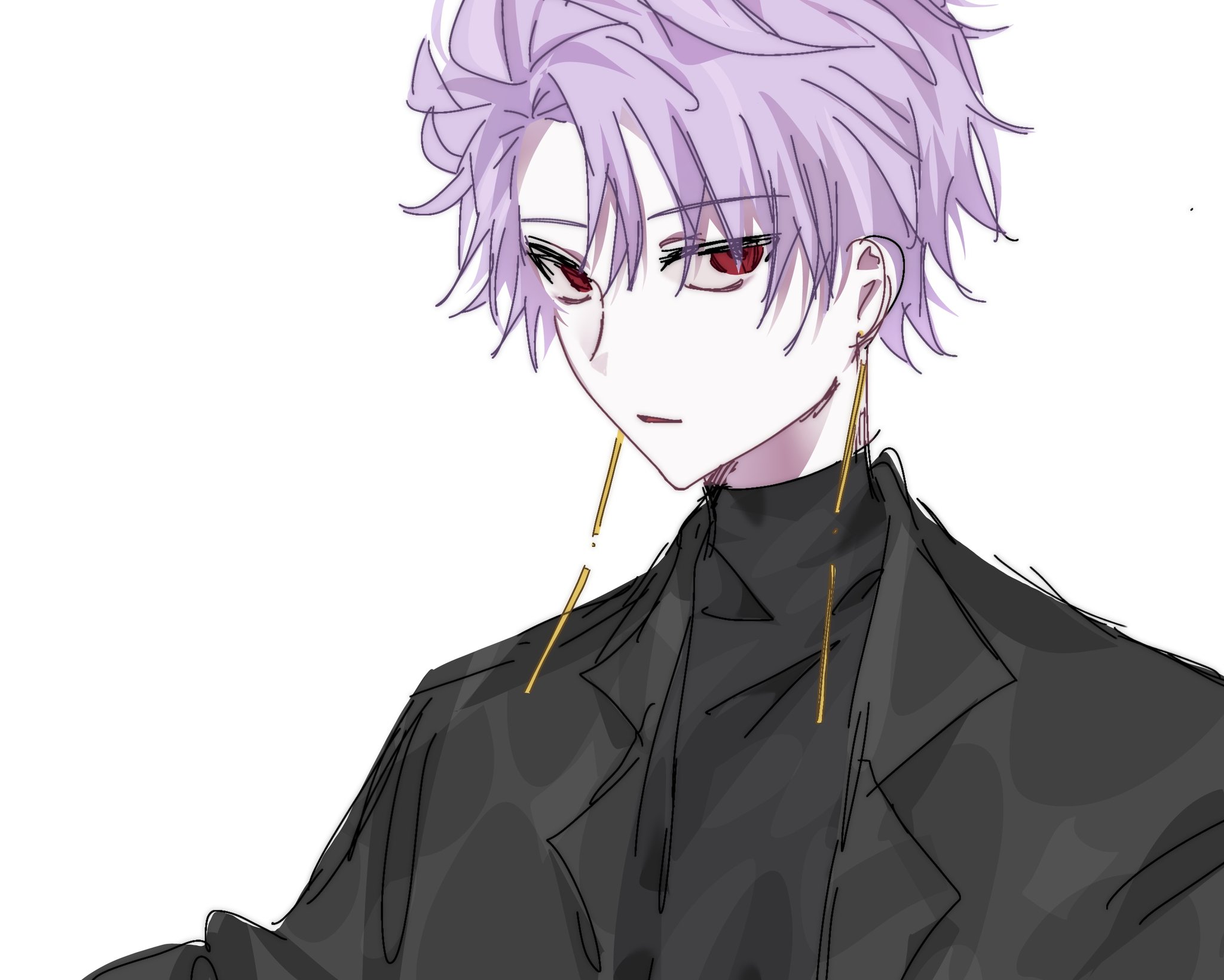 1boy black_jacket black_sweater chinese_commentary commentary_request earrings eyes_visible_through_hair highres jacket jewelry male_focus meshi_(f7oi4f) open_clothes open_jacket open_mouth pale_skin red_eyes saibou_shinkyoku short_hair simple_background solo sweater theodore_riddle turtleneck turtleneck_sweater white_background