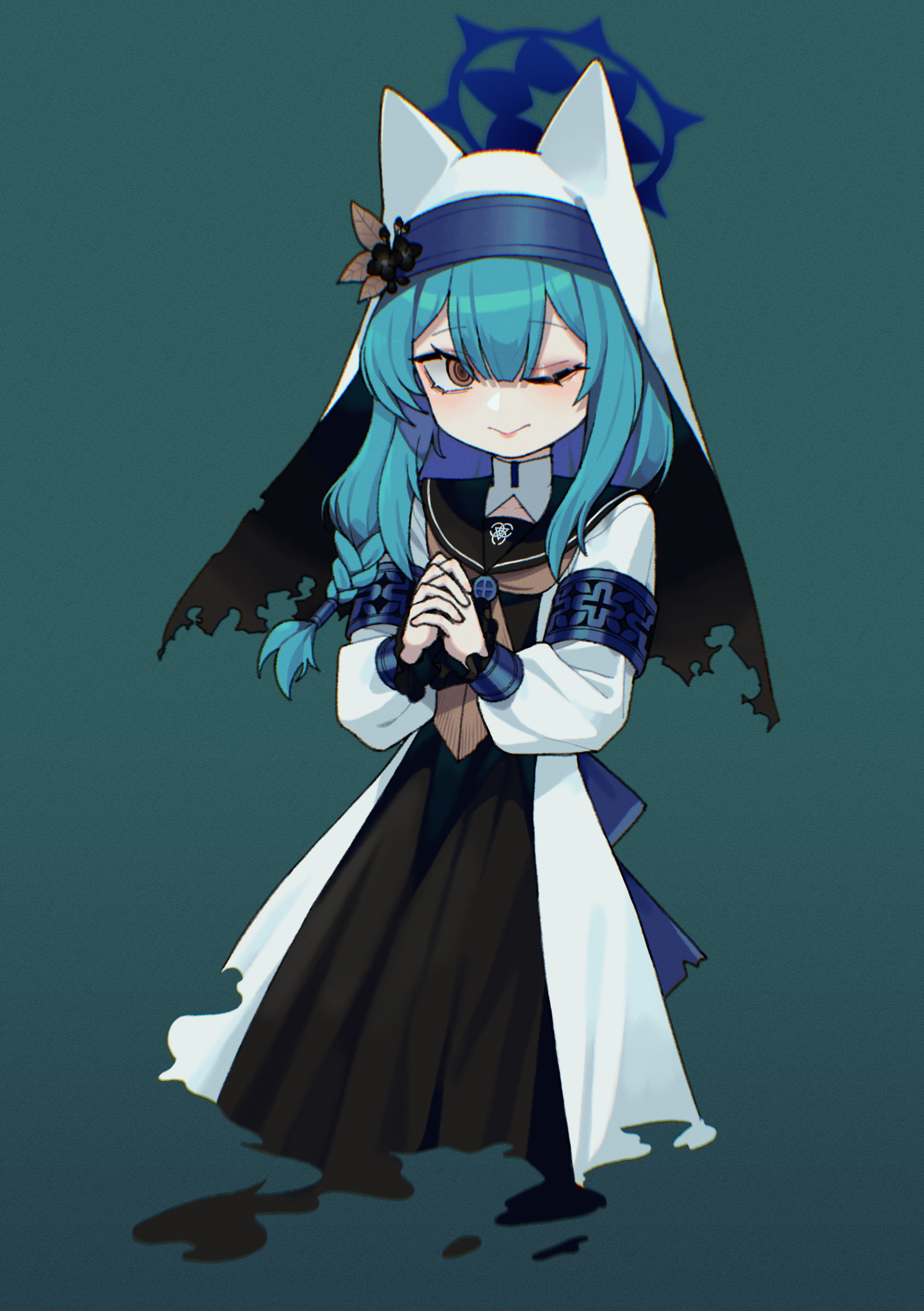 1girl 28_(282teeth) absurdres alternate_color animal_ear_headwear black_sailor_collar blue_archive blue_hair blue_halo braid brown_eyes brown_neckerchief closed_mouth coif fake_animal_ears flower habit halo hat hat_flower highres long_hair long_sleeves mari_(blue_archive) neckerchief nun puffy_long_sleeves puffy_sleeves sailor_collar single_braid smile solo white_hat