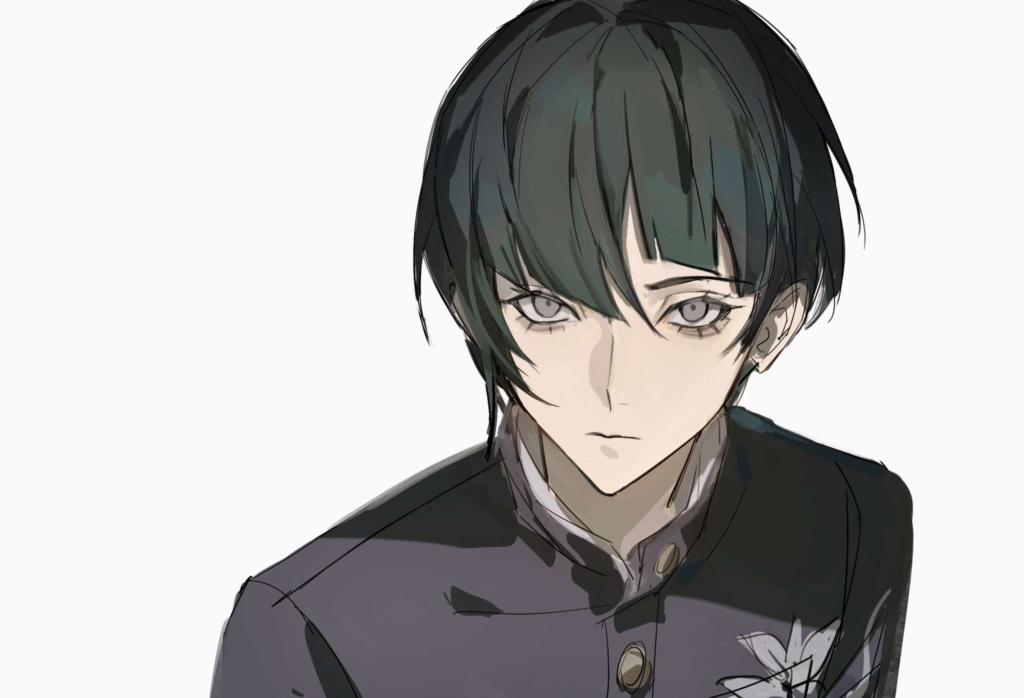 1boy binxngchng1 black_hair closed_mouth hair_between_eyes highres jacket male_focus protagonist_(smtv) protagonist_(student)_(smtv) shin_megami_tensei shin_megami_tensei_v shin_megami_tensei_v:_vengeance short_hair solo uneven_bangs white_background