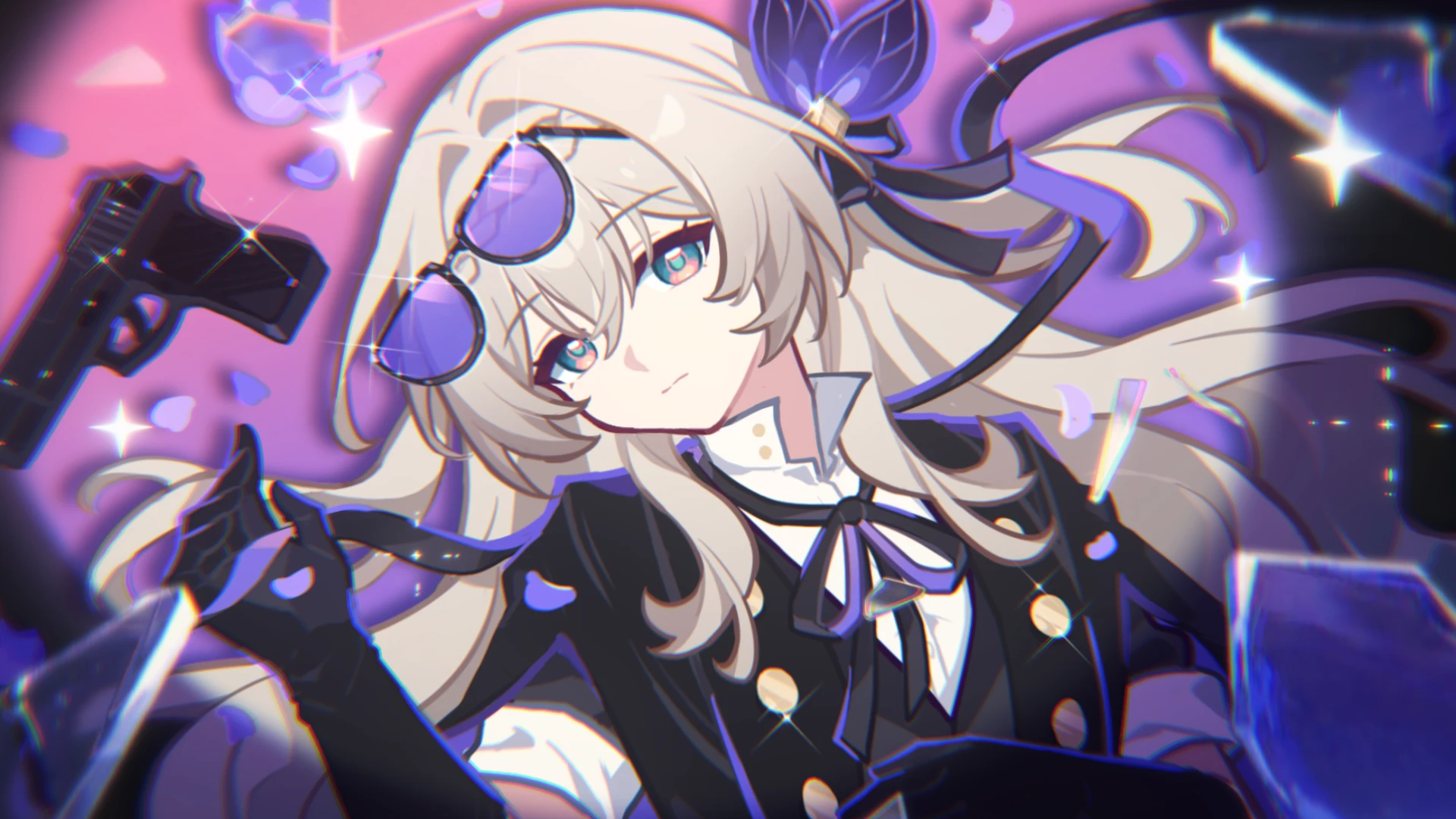 1girl alternate_costume black_bow black_gloves black_jacket black_vest blue_eyes bow braid broken_glass chinese_commentary chromatic_aberration closed_mouth commentary_request elbow_gloves firefly_(honkai:_star_rail) from_above glass gloves green_pupils gun hair_between_eyes hair_bow hair_intakes hand_on_own_stomach handgun highres honkai:_star_rail honkai_(series) jacket long_hair lying multicolored_eyes on_back open_clothes open_jacket shirt solo upper_body vest weapon white_hair white_shirt xiaohutu