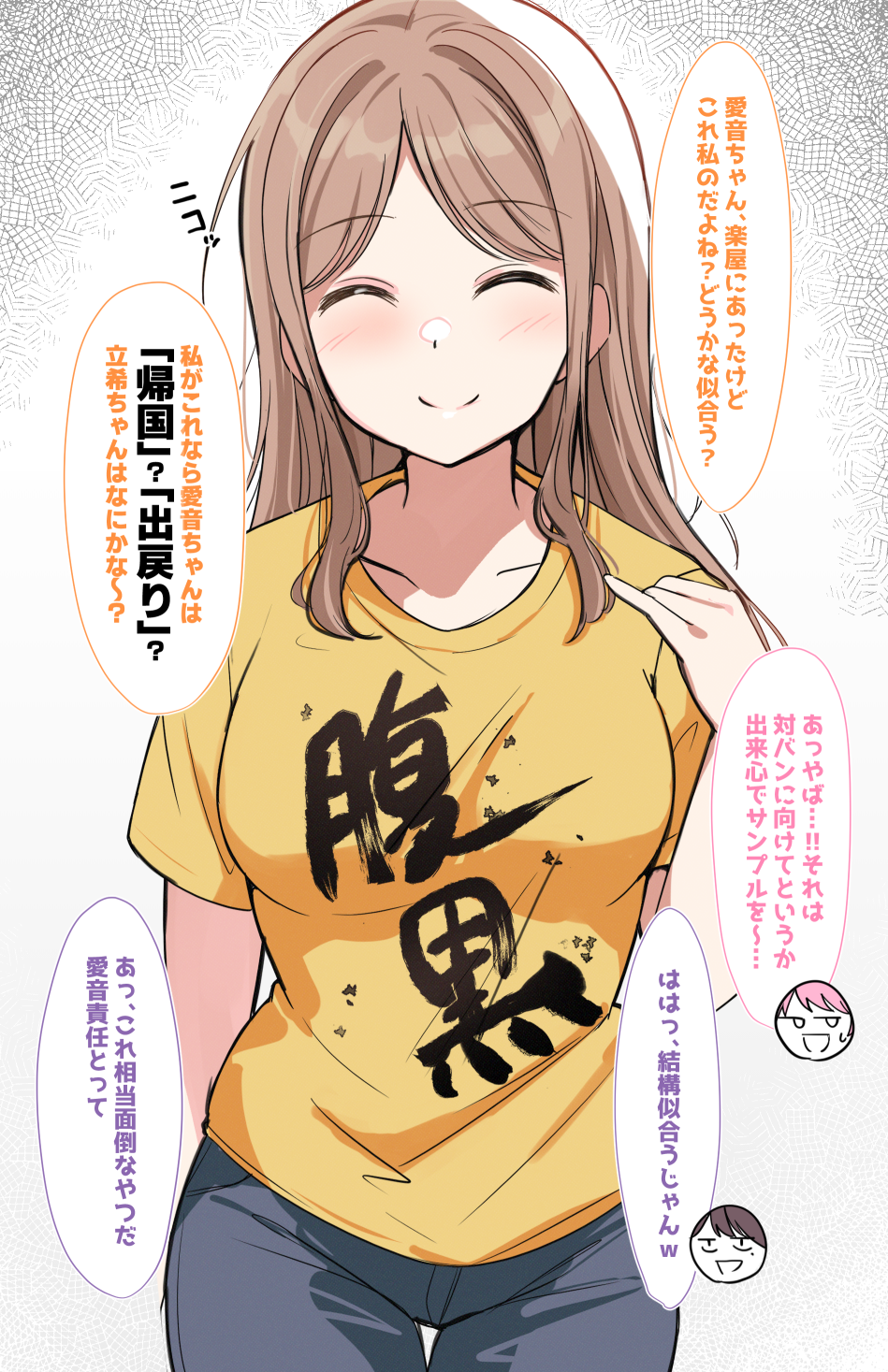 3girls ^_^ bang_dream! bang_dream!_it's_mygo!!!!! blue_pants blush breasts brown_hair chihaya_anon closed_eyes closed_mouth clothes_writing collarbone commentary_request girls_band_cry hand_up highres long_hair medium_breasts multiple_girls nagasaki_soyo pants parted_bangs shiina_taki shiitake_taishi shikai_no_sumi_kuchiru_oto shirt short_sleeves smile translation_request yellow_shirt