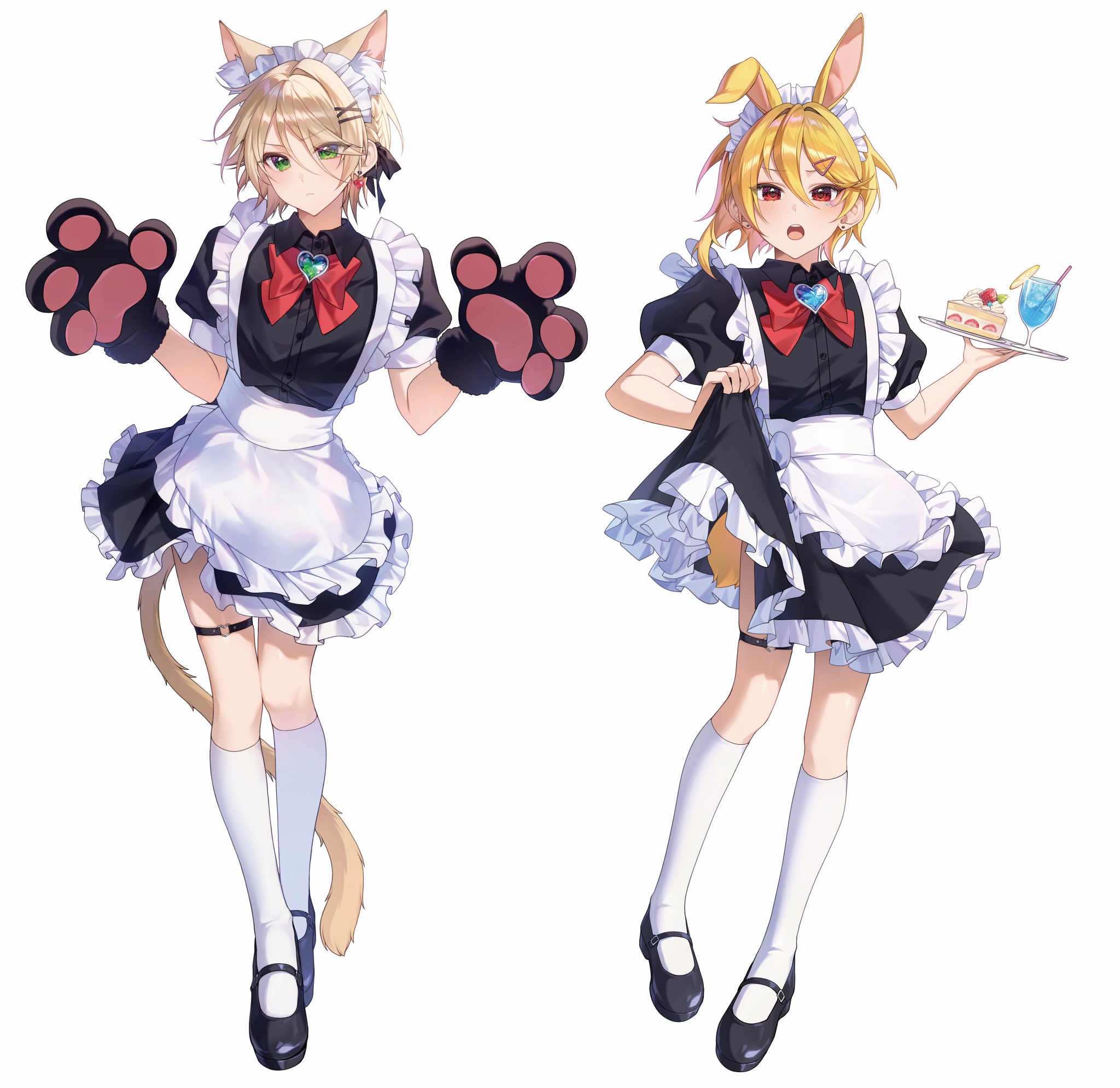 2boys :o alternate_costume animal_ears animal_hands apron bag black_dress black_footwear black_gloves blonde_hair blue_gem bow bowtie brooch cake cake_slice cat_ears cat_tail clothes_lift collared_dress contrapposto crossdressing crossdressing_(mtf) crossed_legs cup dress drinking_glass earrings enmaided ensemble_stars! eyes_visible_through_hair facing_viewer food frilled_apron frilled_dress frills full_body gem gloves green_eyes green_gem hair_between_eyes hands_up heart heart-shaped_gem heart_brooch heart_o-ring highres holding holding_plate jewelry kemonomimi_mode kes_0210 kneehighs looking_at_viewer maid male_focus male_maid mary_janes multiple_boys nito_nazuna o-ring o-ring_strap open_hands paw_gloves paw_print_palms plate puffy_short_sleeves puffy_sleeves rabbit_ears rabbit_tail red_bow red_eyes shiratori_aira_(ensemble_stars!) shirt_tucked_in shoes short_dress short_hair short_sleeves side-by-side simple_background skinny skirt skirt_lift sleeve_cuffs socks tail thigh_strap trap waist_apron watson_cross white_background white_bag white_socks wing_collar