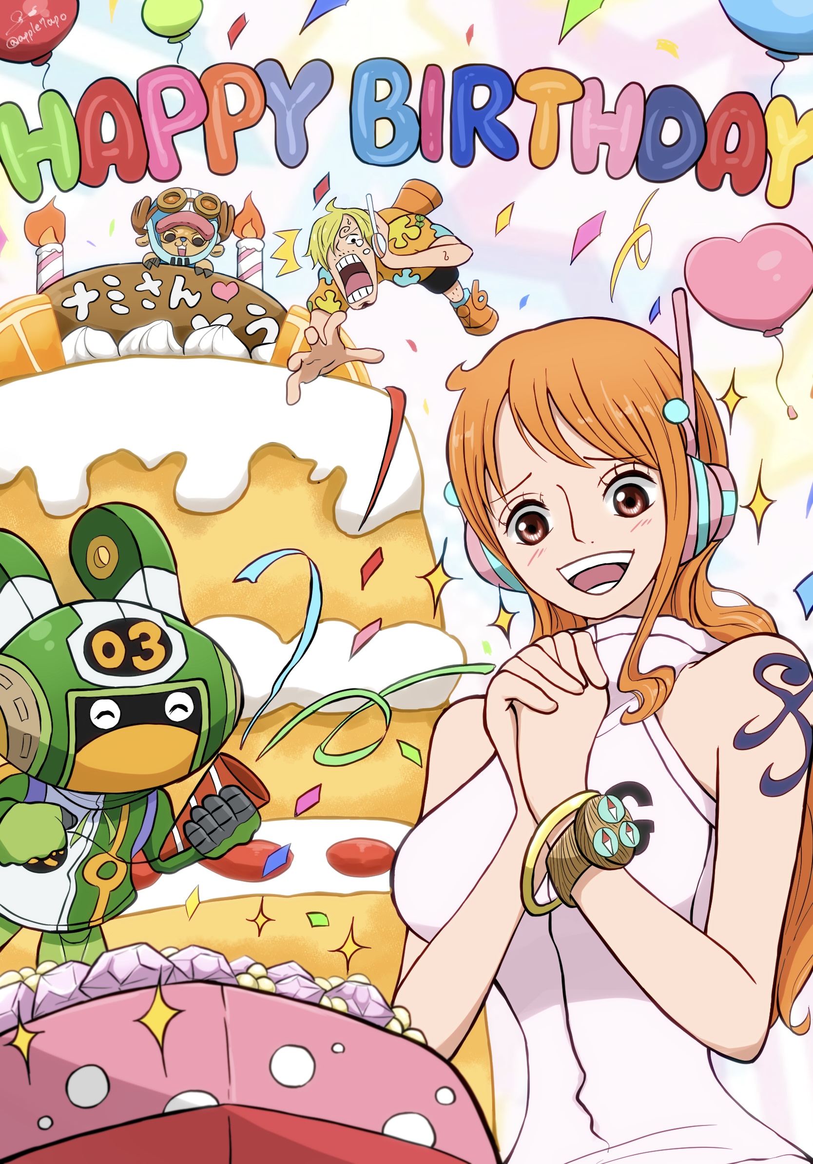 1girl 3boys apple7apo birthday birthday_cake cake food happy highres long_hair multiple_boys nami_(one_piece) nami_(one_piece)_(egghead) one_piece sanji_(one_piece) shoulder_tattoo smile tattoo tony_tony_chopper vegapunk_edison