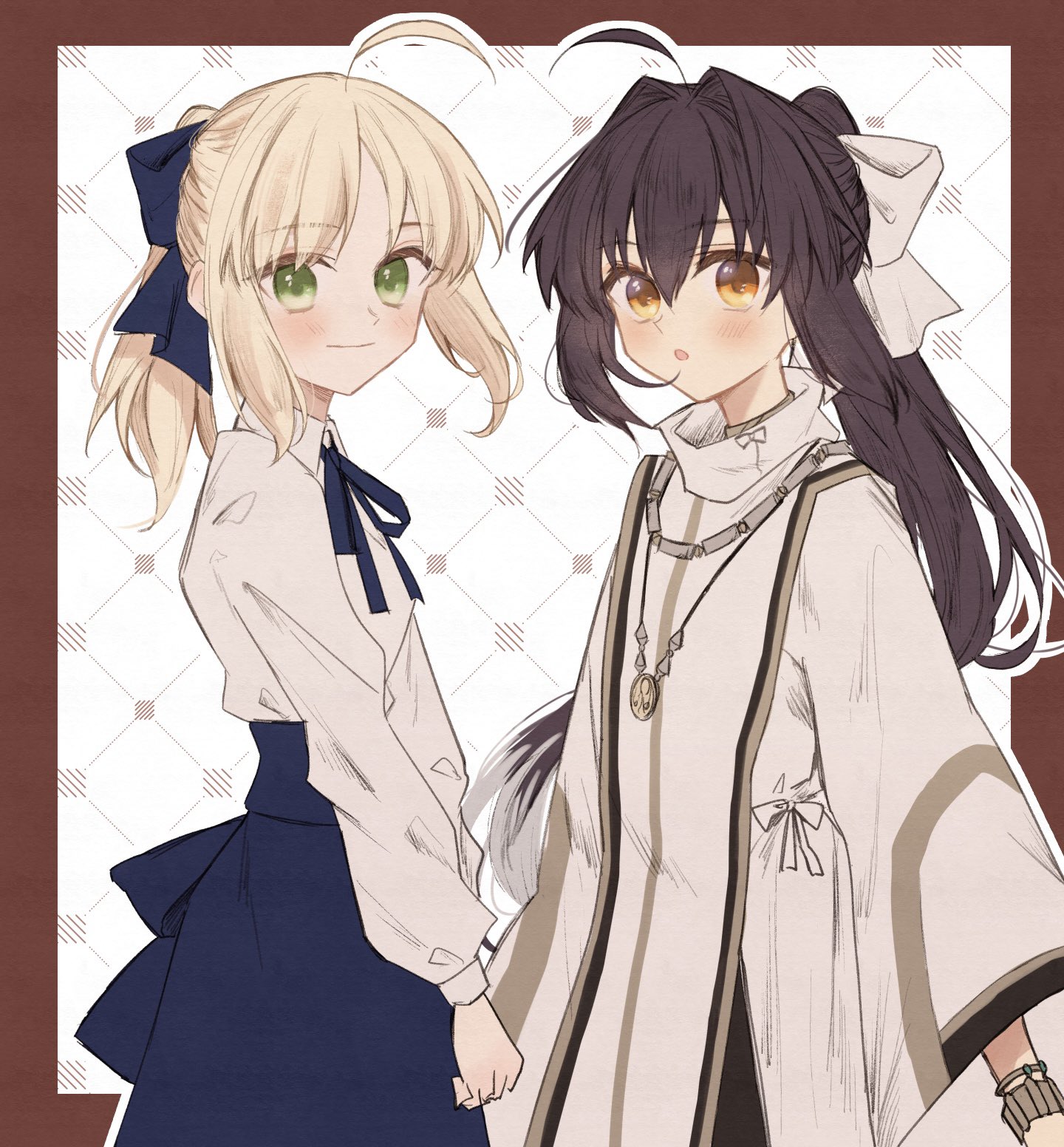 1girl 1other ahoge alternate_hairstyle argyle_background artoria_pendragon_(fate) black_hair blonde_hair blue_bow blue_ribbon blue_skirt border bow bracelet brown_border collared_shirt fate/samurai_remnant fate/stay_night fate_(series) green_eyes hair_bow hair_intakes highres japanese_clothes jewelry long_sleeves neck_ribbon necklace outside_border ponytail printemps ribbon saber_(fate) shirt sidelocks skirt white_bow white_shirt wide_sleeves yamato_takeru_(fate) yellow_eyes