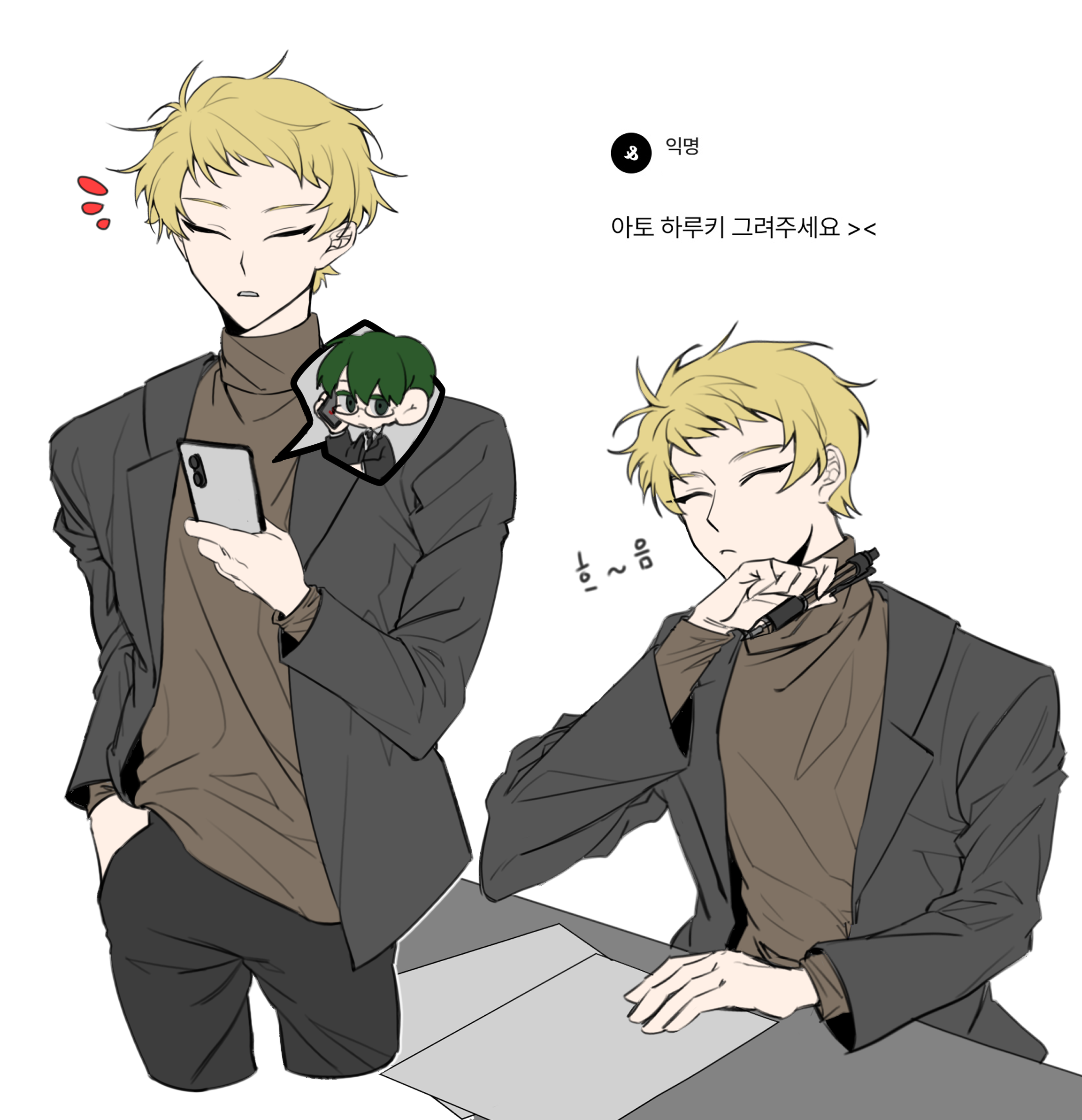 2boys atou_haruki black_jacket black_pants blonde_hair brown_sweater cellphone chibi chibi_inset closed_eyes gomnyong green_eyes green_hair hand_in_pocket highres holding holding_pen holding_phone jacket korean_text long_sleeves male_focus multiple_boys notice_lines open_clothes open_jacket otowa_rui_(saibou_shinkyoku) pants papers pen phone saibou_shinkyoku short_hair simple_background sweater translation_request turtleneck turtleneck_sweater white_background
