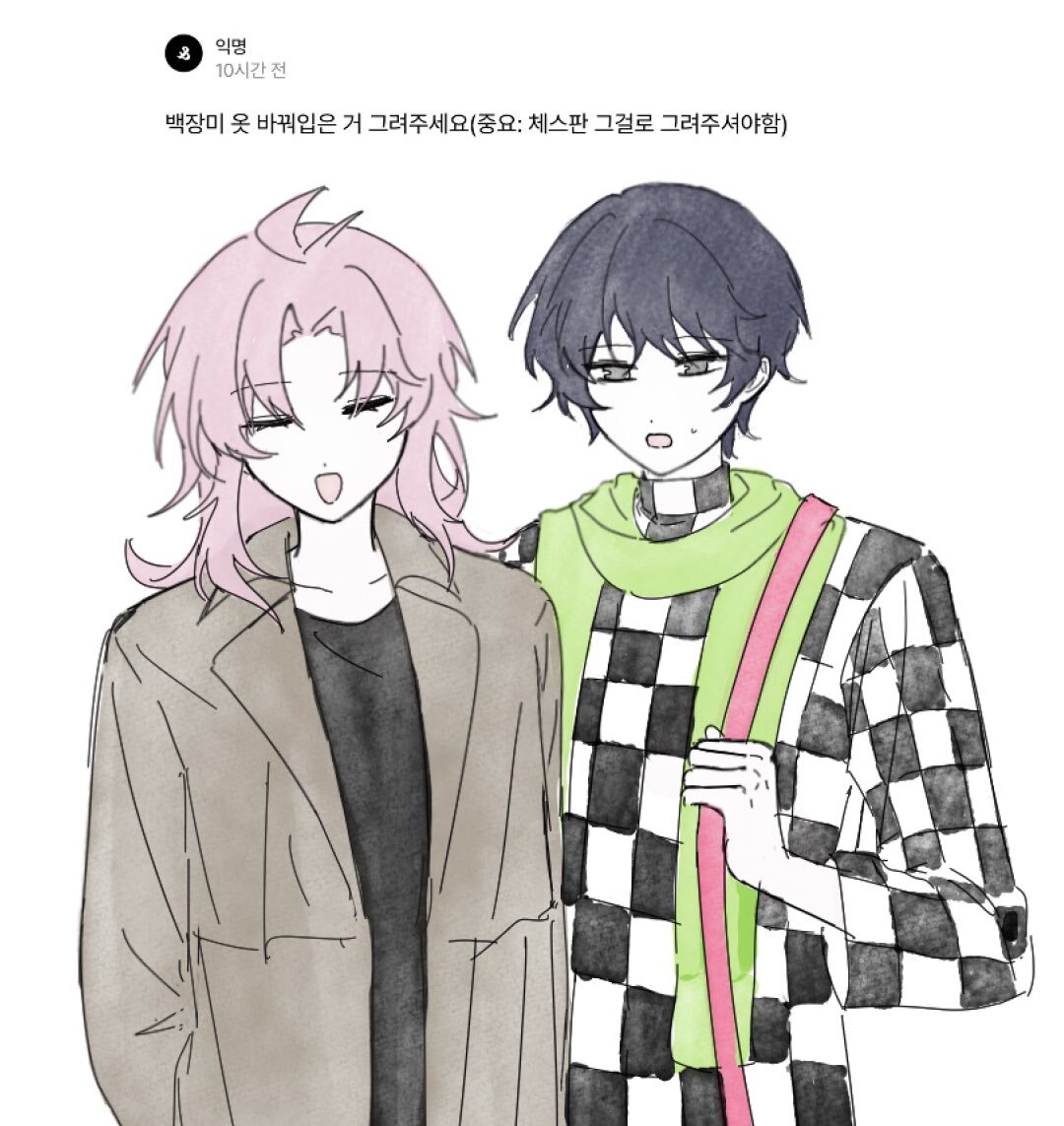 2boys black_hair black_shirt brown_jacket checkered_clothes checkered_shirt closed_eyes colored_skin commentary_request cosplay costume_switch green_scarf grey_eyes hatsutori_hajime hatsutori_hajime_(cosplay) jacket korean_commentary korean_text long_hair long_sleeves male_focus mong2cha multiple_boys open_clothes open_jacket open_mouth pink_hair saibou_shinkyoku scarf shirt simple_background smile sweat translation_request upper_body utsugi_noriyuki utsugi_noriyuki_(cosplay) white_background white_skin