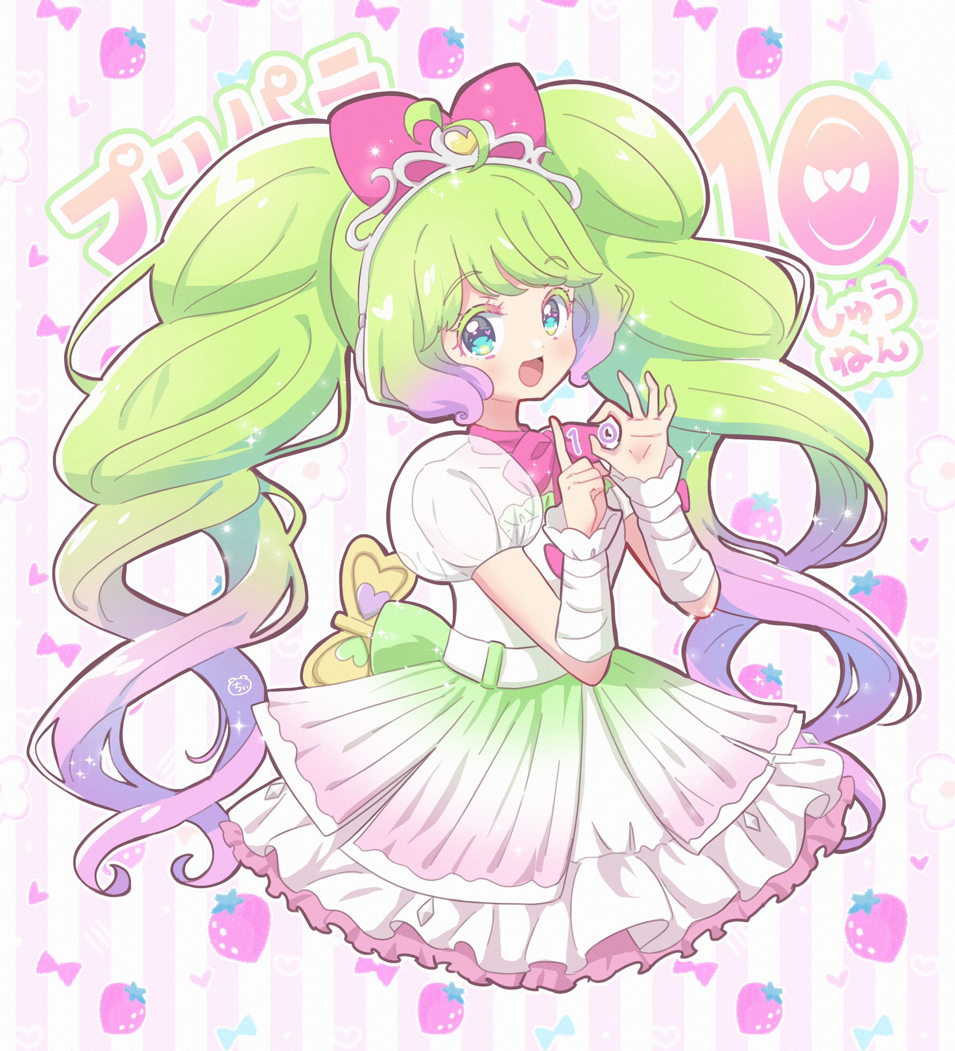 1girl :d ahoge anniversary blue_eyes bow chii_(chi_pppuri) colored_eyelashes commentary cropped_legs cropped_torso curly_hair detached_sleeves dot_nose dress finger_counting food frilled_dress frills fruit gradient_hair green_hair highres laalulu long_hair looking_at_viewer multicolored_hair open_mouth pink_bow pretty_series pripara puffy_short_sleeves puffy_sleeves purple_hair see-through_clothes see-through_sleeves short_sleeves smile solo strawberry striped_background tiara translated twintails very_long_hair white_dress