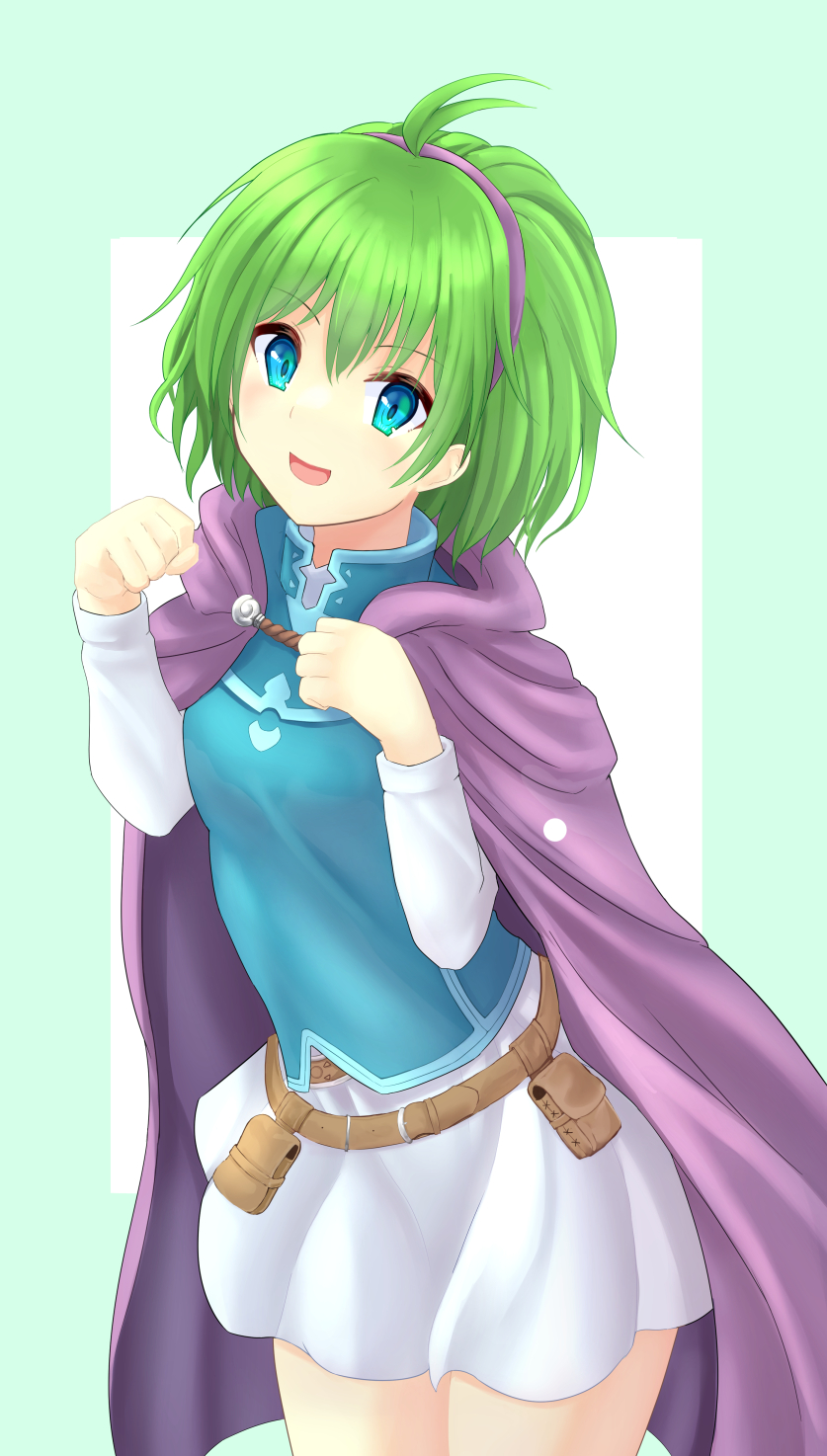 1girl ahoge belt belt_pouch blue_eyes blue_shirt cape el_(el406) fire_emblem fire_emblem:_the_blazing_blade green_background green_hair headband highres nino_(fire_emblem) nintendo pouch purple_cape purple_headband shirt skirt white_skirt white_sleeves