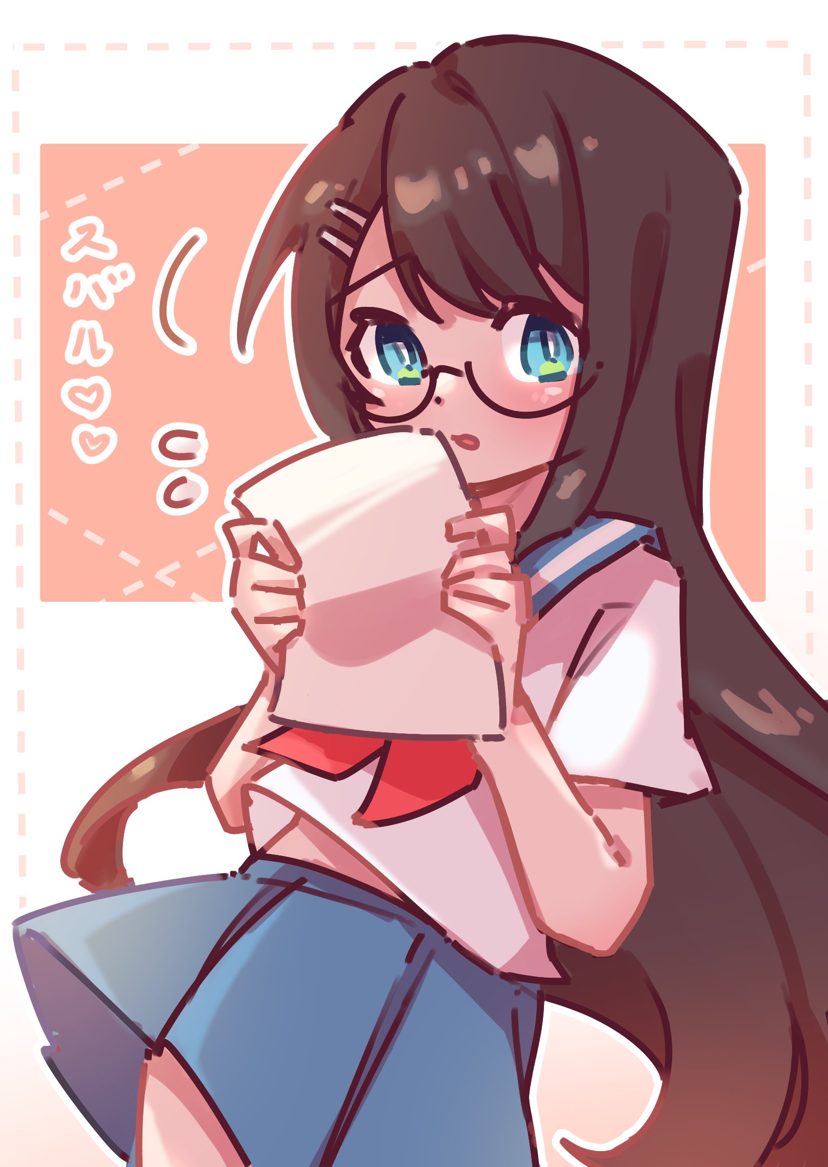 1girl bespectacled black_hair blue_eyes commentary glasses hair_ornament hairclip hashtag-only_commentary heart highres holding holding_paper hololive long_hair miniskirt oozora_subaru paper pleated_skirt school_uniform serafuku skirt solo tapiobanana translation_request very_long_hair virtual_youtuber