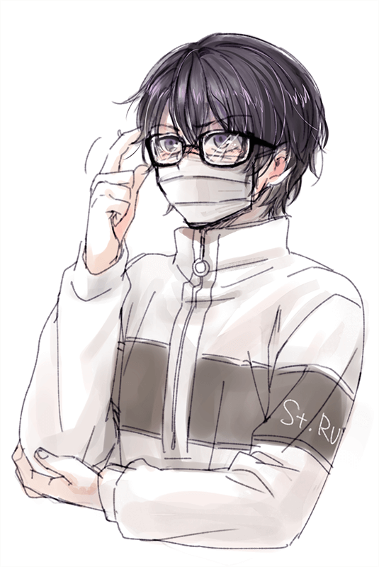 1boy 3_1_21 adjusting_eyewear black-framed_eyewear black_hair glasses hair_between_eyes hand_on_own_elbow jacket looking_afar mask mizuki_hajime mouth_mask purple_eyes short_hair solo surgical_mask tennis_no_ouji-sama track_jacket wavy_hair white_background