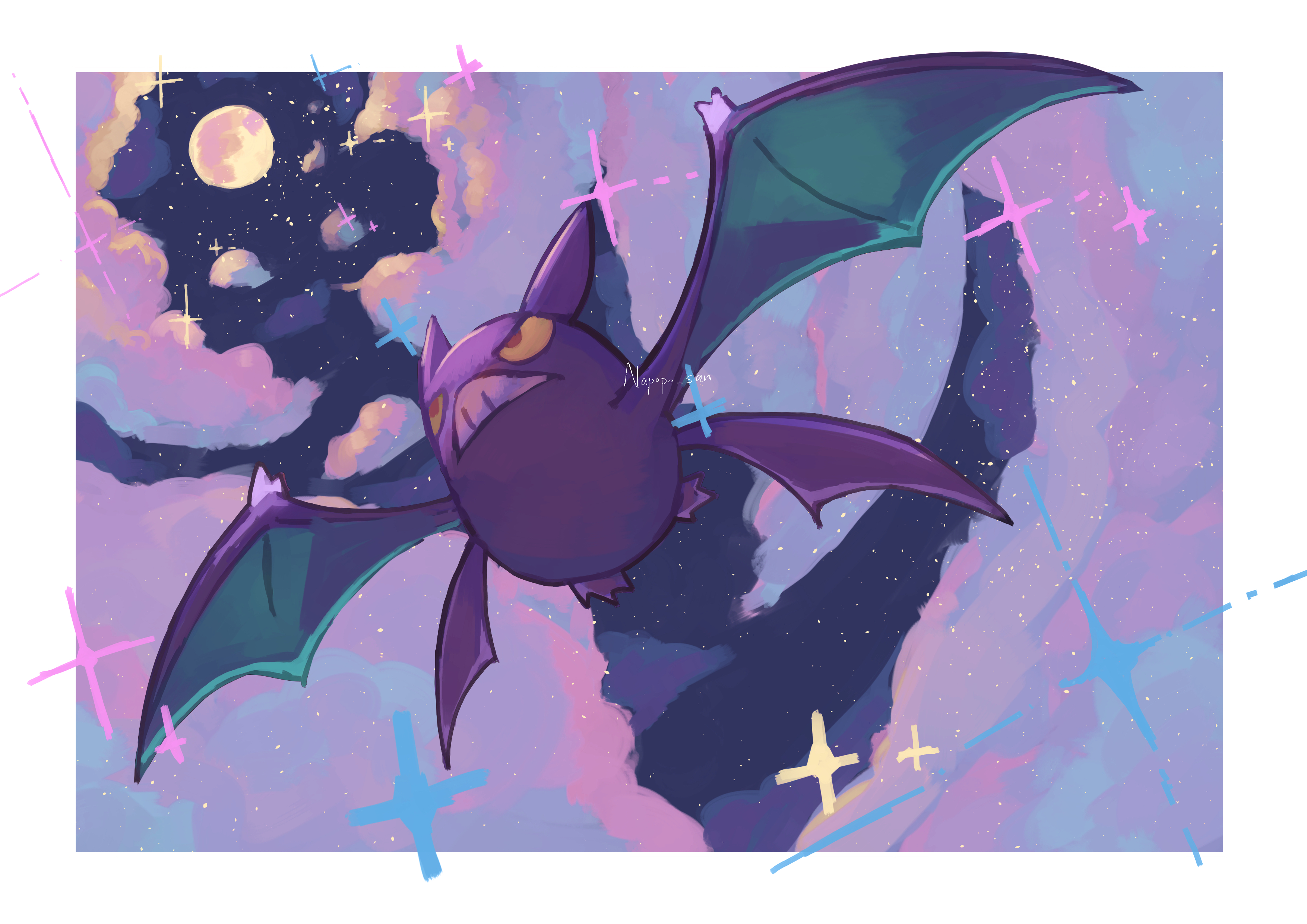 absurdres animal_focus artist_name bat_(animal) blue_sky border cloud colored_sclera crobat flying full_body full_moon gen_2_pokemon highres looking_afar moon napopo night nintendo no_humans outdoors outside_border pokemon pokemon_(creature) red_eyes signature sky solo sparkle star_(sky) teeth white_border yellow_sclera