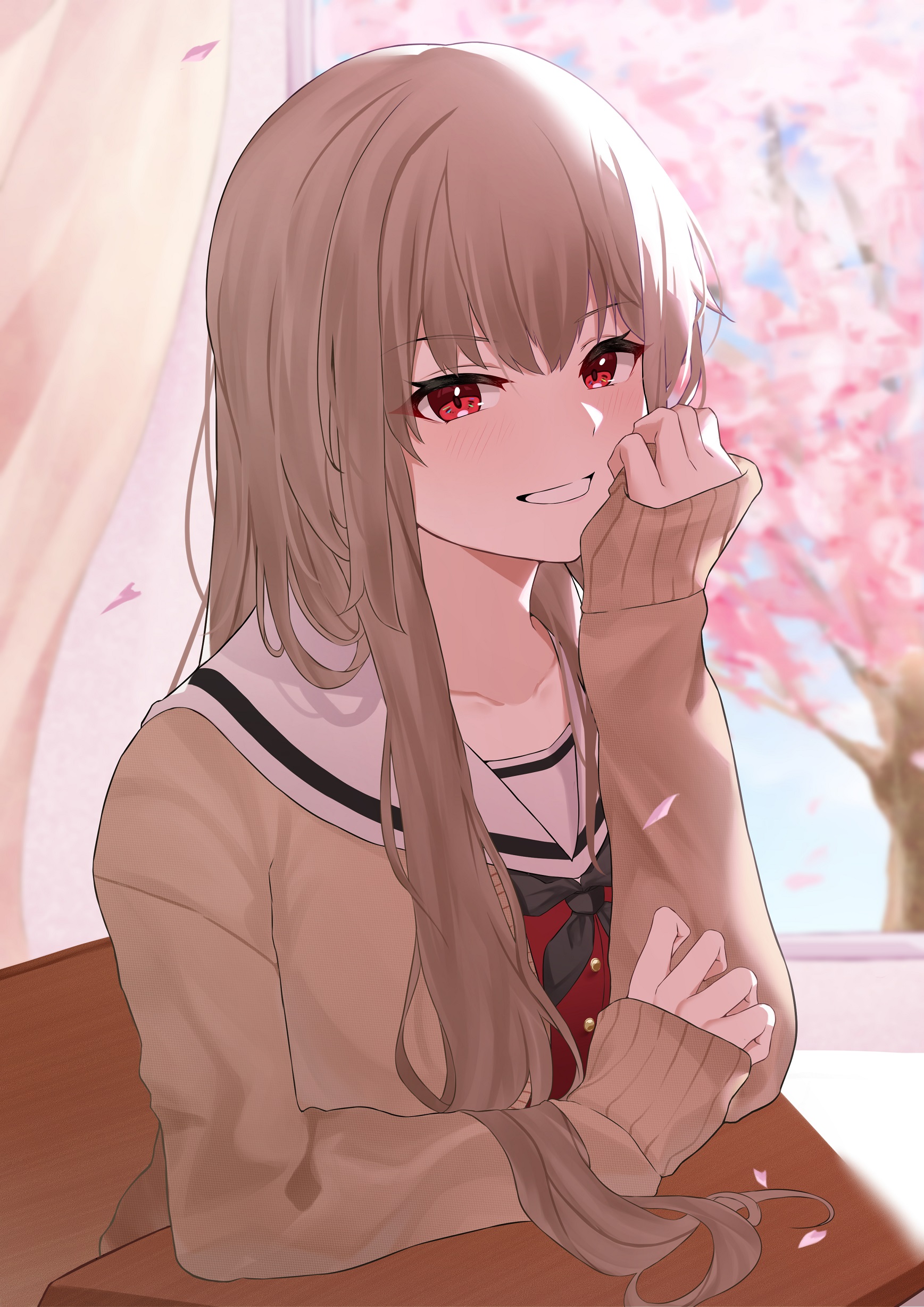 1girl absurdres arm_rest black_neckerchief blush brown_cardigan brown_hair bureoeve cardigan cherry_blossoms commentary_request desk elbow_rest furen_e_lustario furen_e_lustario_(school_uniform) grin hands_up highres indoors long_hair long_sleeves looking_at_viewer neckerchief nijisanji official_alternate_costume official_alternate_hairstyle open_cardigan open_clothes red_eyes red_shirt sailor_collar school_desk school_uniform shirt sidelocks sleeves_past_wrists smile solo teeth tree upper_body very_long_hair virtual_youtuber white_sailor_collar window