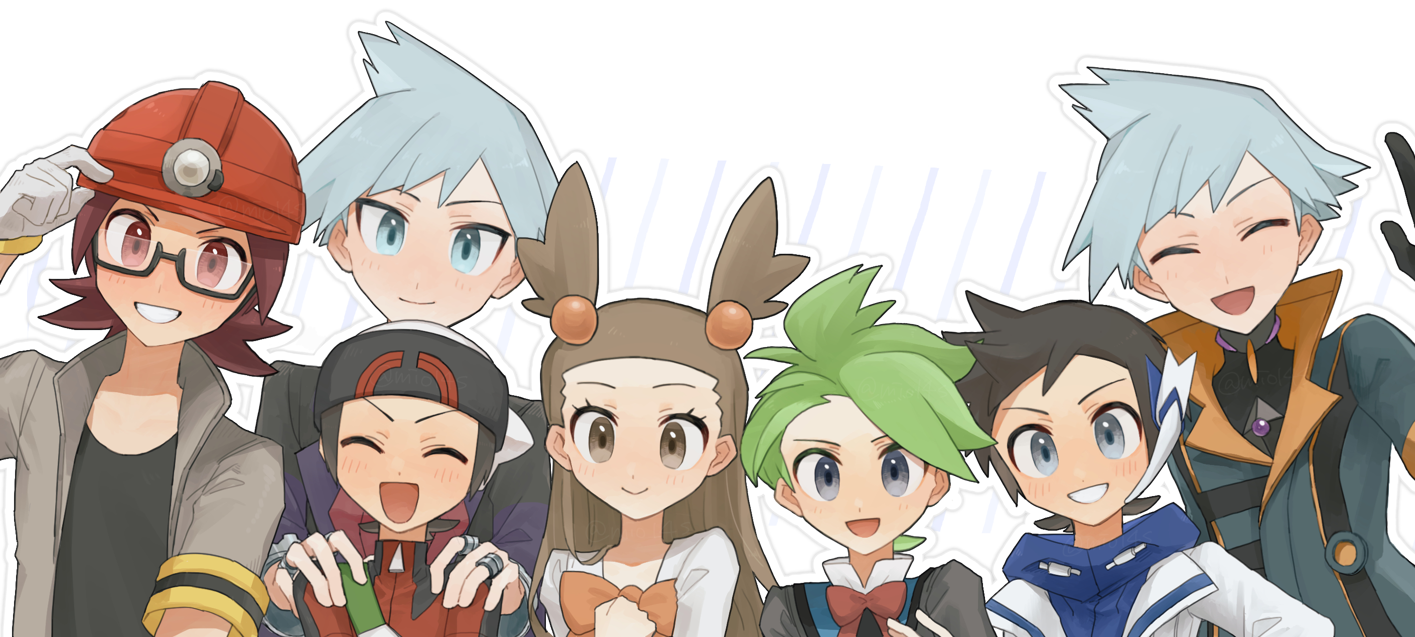 1girl 6+boys :d ^_^ alternate_costume black-framed_eyewear black_shirt blue_eyes blue_hair blue_jacket blue_shirt blush bow bowtie brendan_(pokemon) brendan_(sygna_suit)_(pokemon) brown_eyes brown_hair closed_eyes commentary_request earpiece glasses gloves green_hair grey_eyes grey_jacket grin hair_bobbles hair_ornament hand_on_another's_shoulder hand_on_headwear hand_up hat helmet highres itsumiya_(aida_nagi) jacket jasmine_(pokemon) jewelry light_blue_hair long_hair looking_at_viewer male_focus multiple_boys multiple_rings nintendo official_alternate_costume open_mouth orange_bow pokemon pokemon_diamond/pearl/platinum pokemon_heartgold_and_soulsilver pokemon_masters_ex pokemon_omega_ruby_and_alpha_sapphire red_bow red_bowtie red_eyes red_hair red_helmet red_shirt ring roark_(pokemon) shirt short_hair short_sleeves smile steven_stone steven_stone_(sygna_suit) two_side_up wally_(pokemon) wally_(sygna_suit)_(pokemon) white_gloves white_jacket