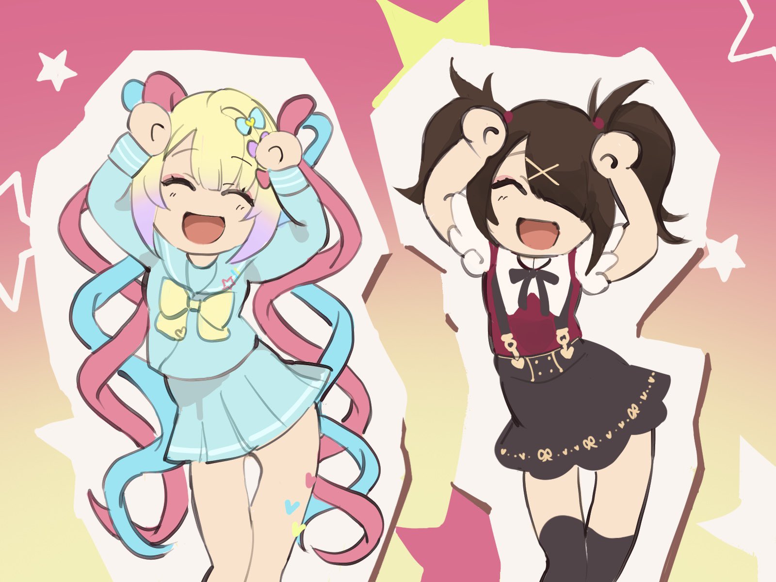 2girls :d ^_^ ame-chan_(needy_girl_overdose) arms_up black_ribbon black_skirt blonde_hair blue_bow blue_hair blue_serafuku blue_shirt blue_skirt bow brown_hair caramelldansen chouzetsusaikawa_tenshi-chan closed_eyes collared_shirt commentary_request dancing facing_viewer hair_bow hair_ornament hair_over_one_eye highres long_hair long_sleeves mizureito multicolored_hair multiple_girls neck_ribbon needy_girl_overdose open_mouth parody pink_bow pink_hair pleated_skirt purple_bow purple_hair quad_tails rabbit_pose red_shirt ribbon school_uniform serafuku shirt skirt smile standing star_(symbol) suspender_skirt suspenders twintails very_long_hair x_hair_ornament