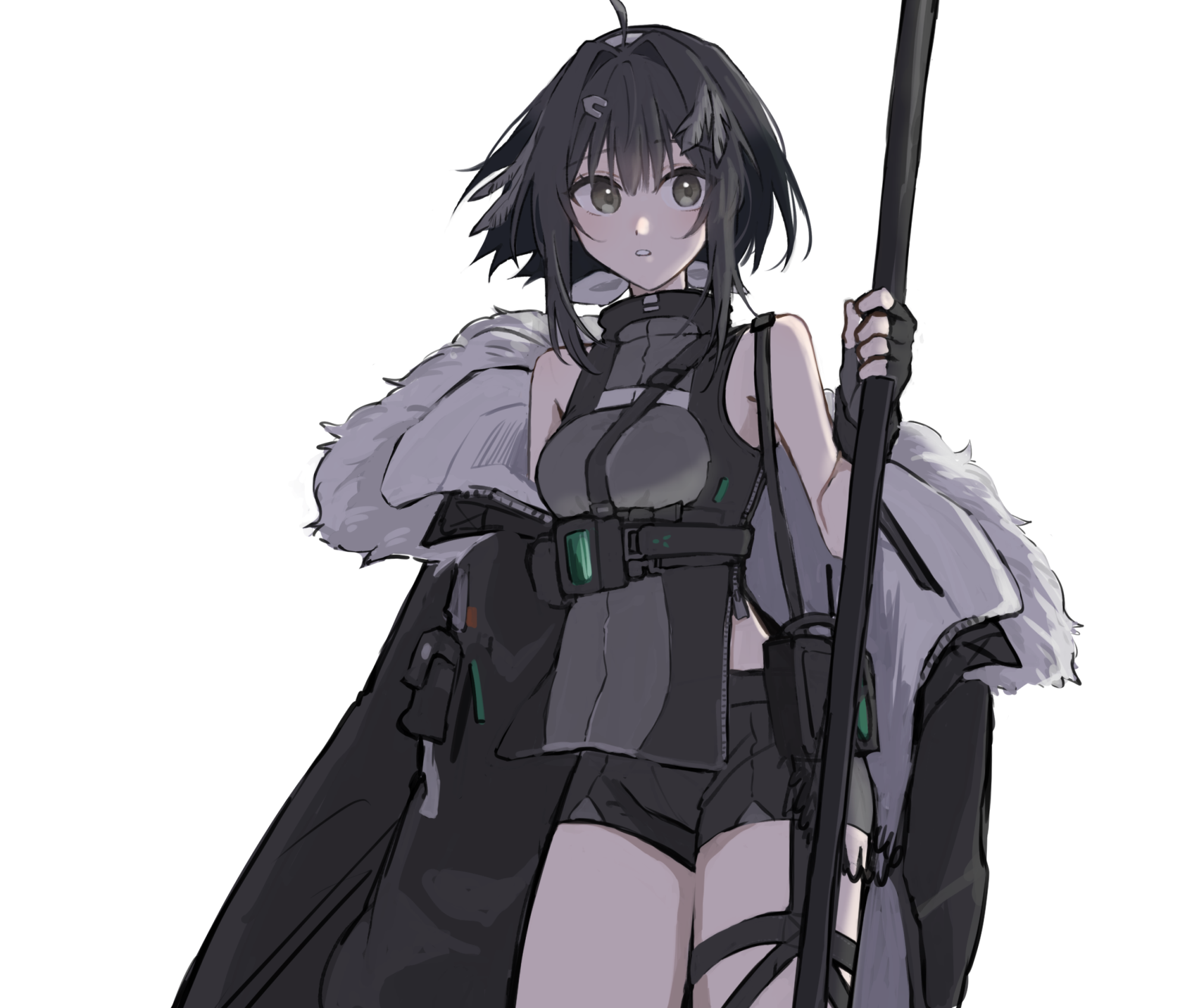 1girl arknights black_gloves black_hair black_jacket black_shirt black_shorts breasts commentary_request cowboy_shot fur-trimmed_jacket fur_trim gloves grey_eyes highres holding jacket la_pluma_(arknights) looking_at_viewer medium_breasts shirt short_hair shorts simple_background sleeveless sleeveless_shirt solo walkie-talkie white_background yoshikichi