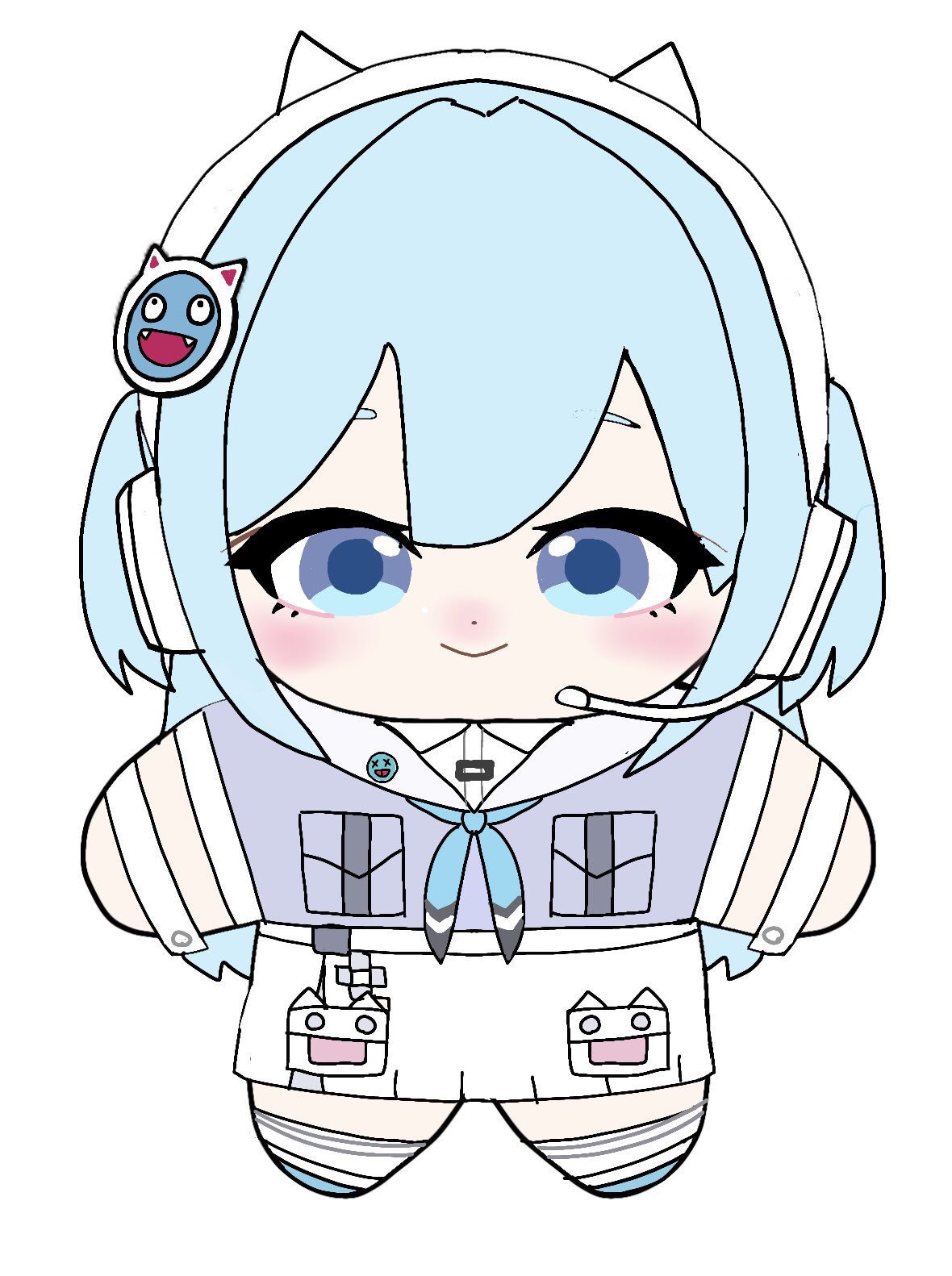 1girl animal_ear_headphones animal_ears blue_eyes blue_hair blue_neckerchief blush chibi collared_dress crop_top dress fake_animal_ears goddess_of_victory:_nikke hair_between_eyes hair_intakes headphones headset highres light_blue_hair long_hair neckerchief shifty_(nikke) short_sleeves side_ponytail smile solo watari_nuigurumi white_dress wrist_cuffs